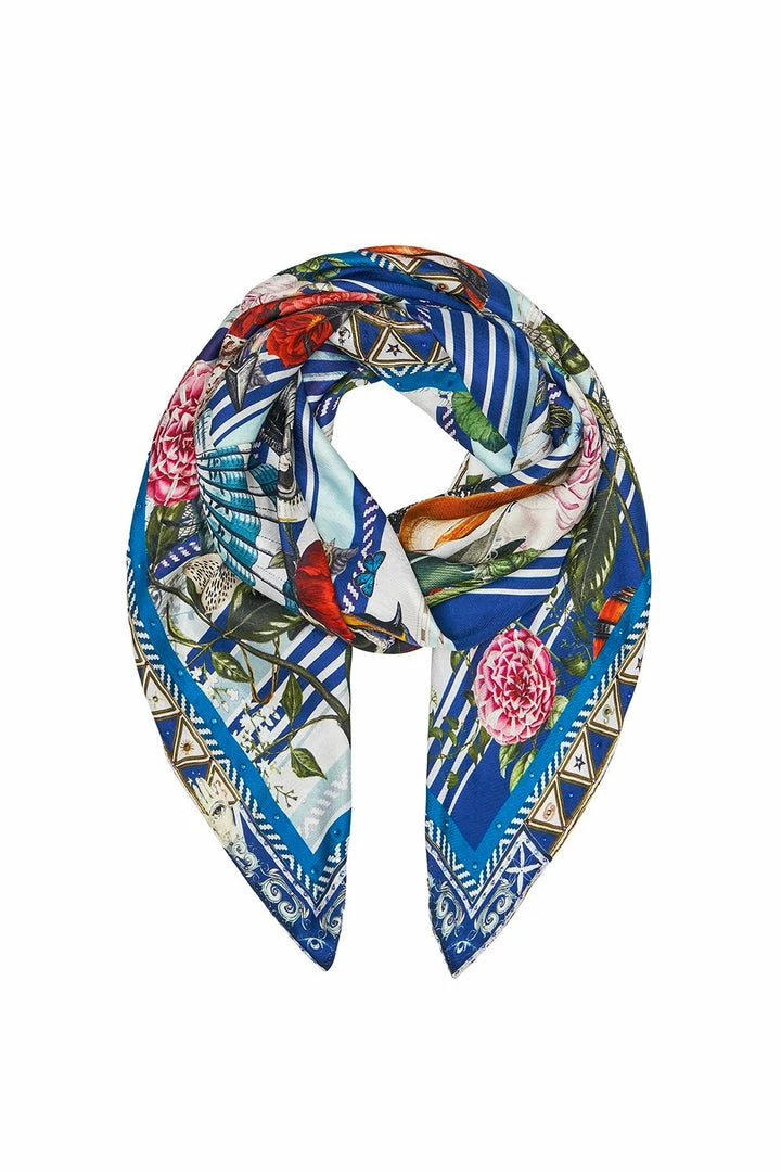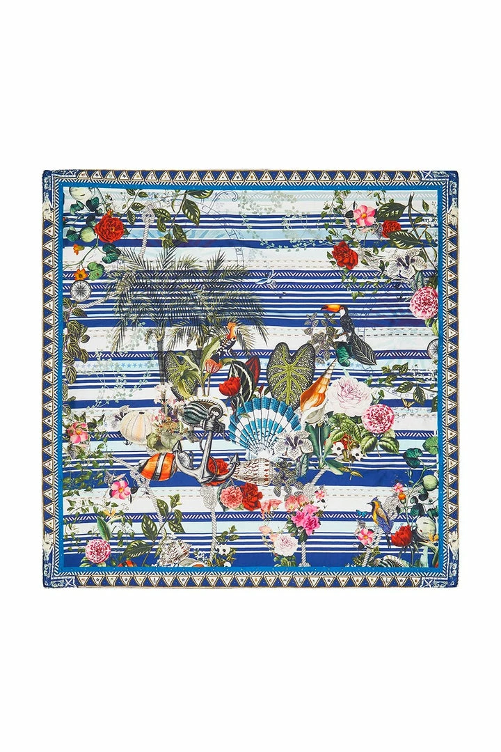 A statement scarf to hang as art or to style a myriad of ways, the effortlessly opulent Solis Heart Large Square Scarf embraces a scene of trippy space gardens and constellations discovered in hippy haunts. This silk scarf features striking nautical stripes with bloomed accents, a striking contrast border, as well as hand-placed crystals as detail. Simply drape around the neck for a statement scarf or visit the CAMILLA style guide to view the many ways to style.