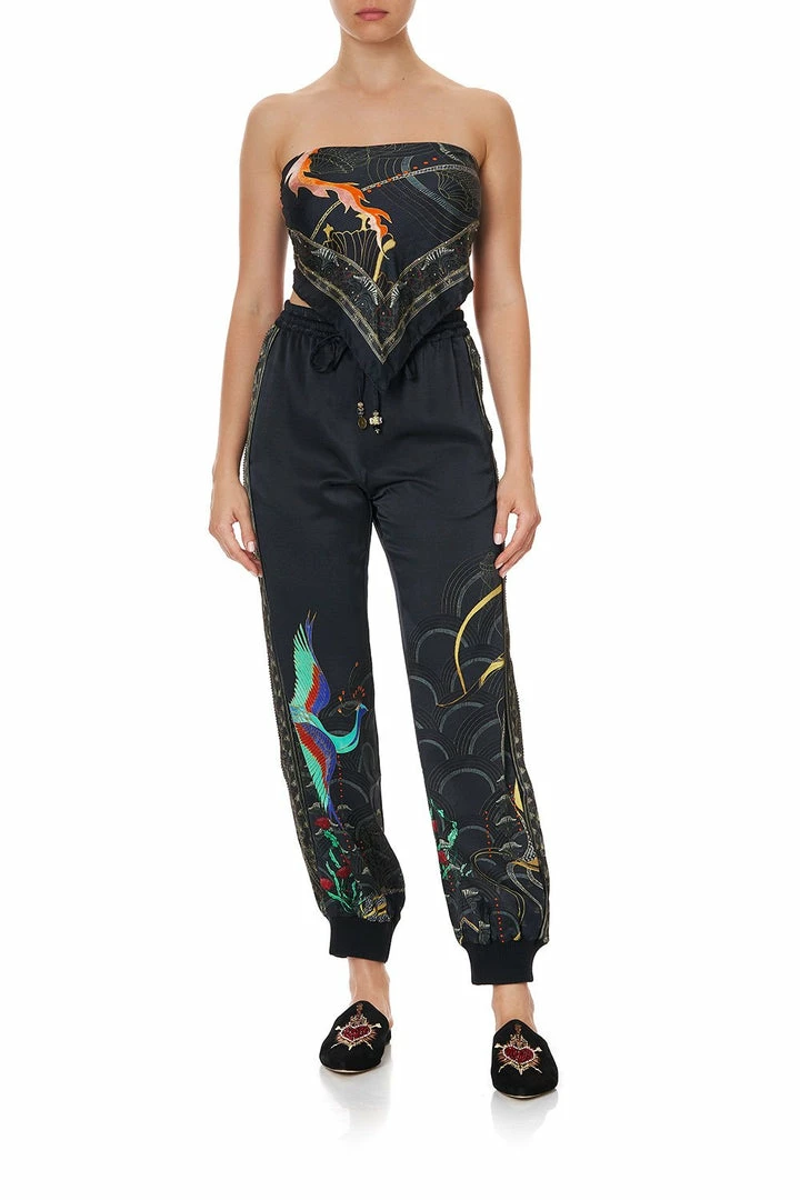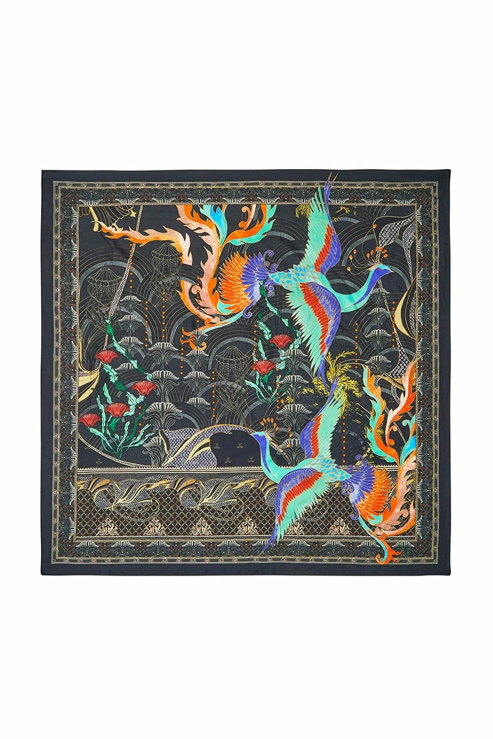A statement scarf to hang as art or to style a myriad of ways, the effortlessly hypnotic Wise Wings Large Square Scarf embraces a midnight scene that hosts a dreamscape of vibrant Persian folklore creatures during their night flight. This silk scarf features a feminine all-over print rich with vibrant hues, a striking contrast border, as well as hand-placed crystals as detail. Simply drape around the neck for a statement scarf or visit the CAMILLA style guide to view the many ways to style.