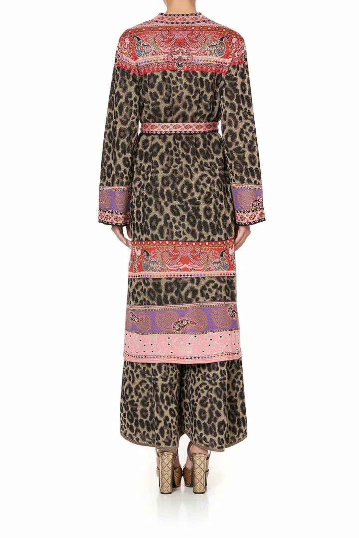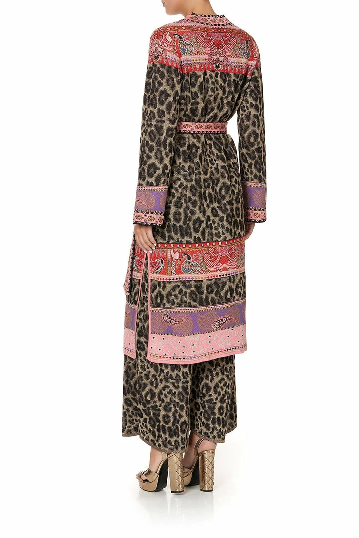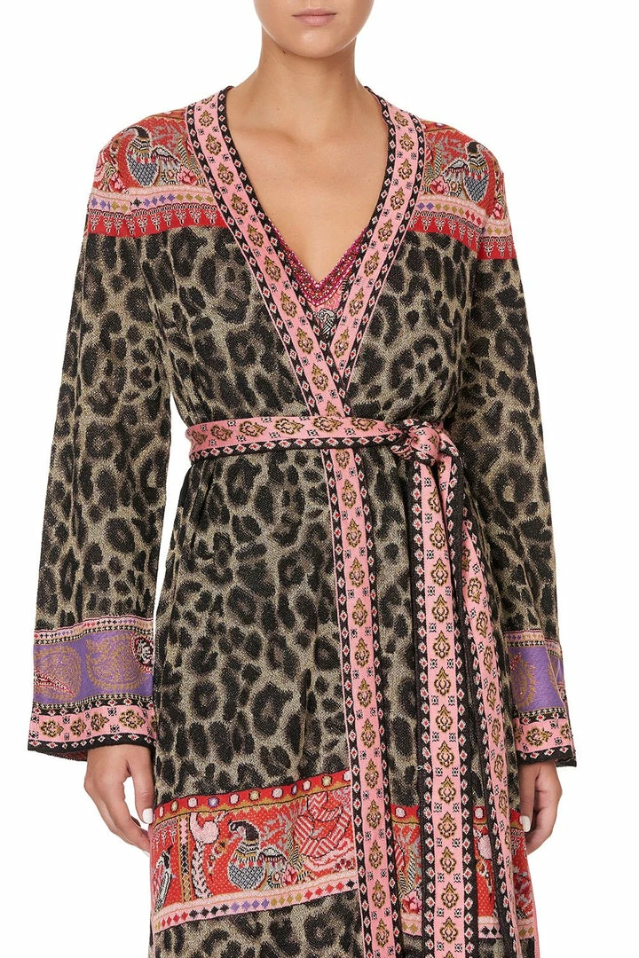 Unravelling the fairytale wonders of her feminine journey, the Lotus Lovers Long Cardigan with Belt evokes the enchanting tales of Punjab’s Phulkari embroidery in a flourish of pink borders and leopard hand crafted detail. Knitted into a beautiful jacquard, this elegant wrap-front cardigan features a striped waist tie, contrast-coloured trim and a luminous metallic thread for a touch of ethereal shine.