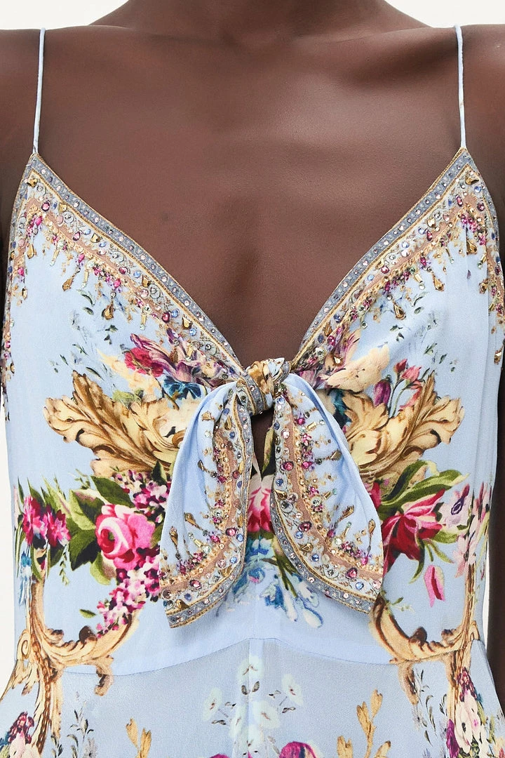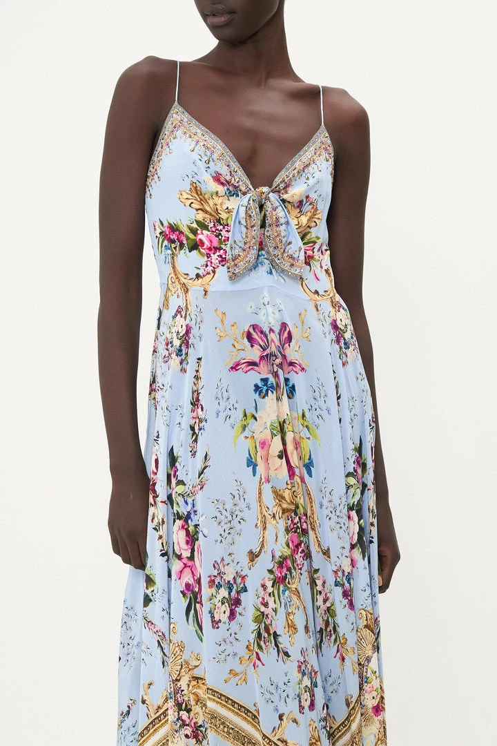 A symphony of golden cascades, our Floraful Long Dress With Tie Front sports a soft sky blue enveloped in ornate gold detailing and flourishing florals in blush and rose hues. Adorning hand-embellished CAMILLA crystals, this dainty summer dress plays host to tie detailing at the sweetheart neckline, a fitted waist, shoestring straps, zip fastening and relaxed silhouette that falls into a flared hemline.