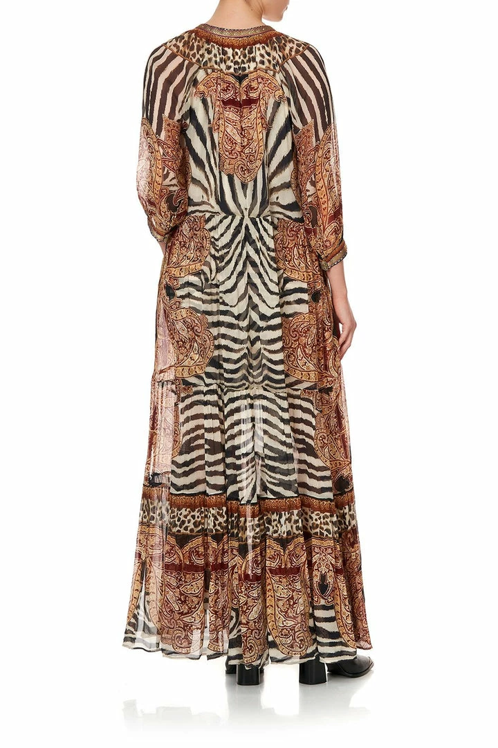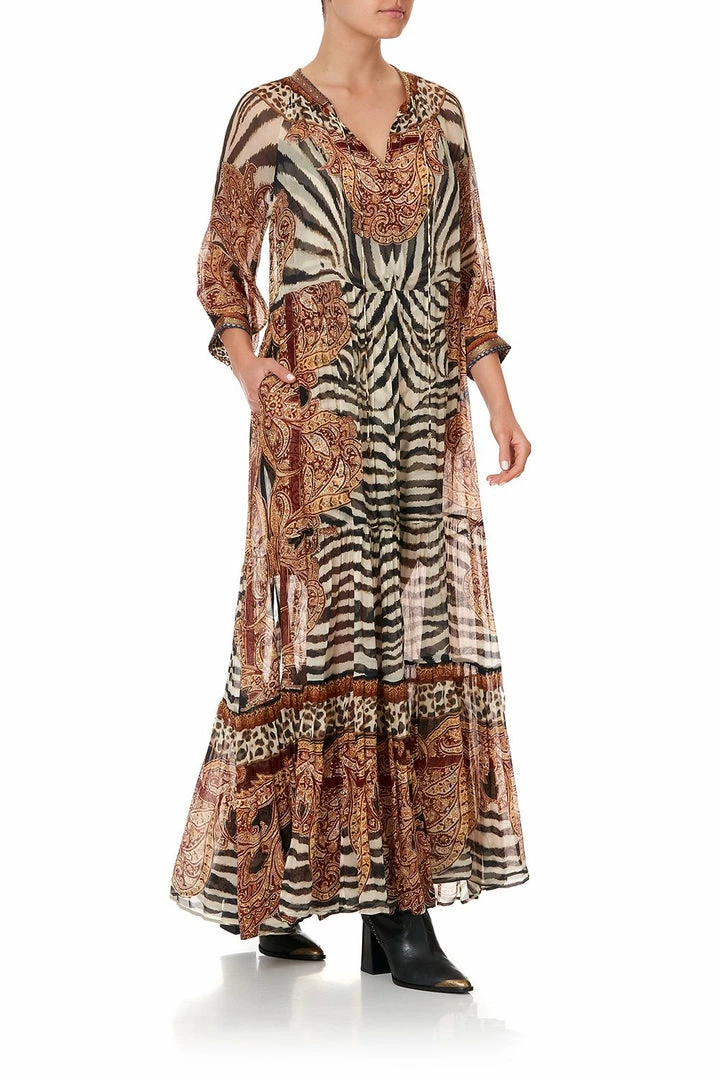 Crafted in silk rich with Russian lounge hues, the Wild Fire Long Gathered Panel Dress carries fierce animal print textiles within the free flowing maxi dress silhouette. With its peasant-style design, this floor length tiered panel dress had dramatic boho flare, also featuring in seam pockets, a decorative buttoned cuff and finished in hand placed CAMILLA crystal embellishments. Pair with your favourite boots and the Wild Fire Woven Twist Headband for chic bohemian look.