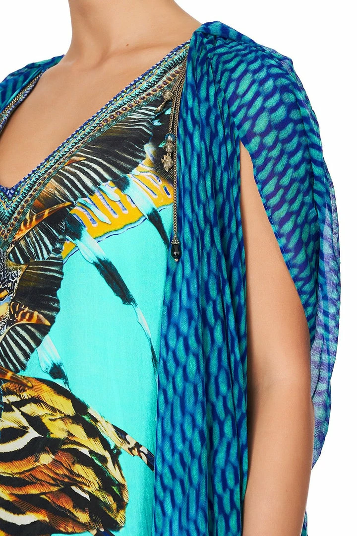 Maxi kaftan with layers of draping silk, the Marine Queen Long Kaftan With Overlay Detail is an ethereal masterpiece inspired by underwater life beneath a glittering ocean surface. This one of a kind pure printed silk dress features gently flowing movement, metallic gold chains at the shoulders and a contrast cape style overlay, complete with a heavily embellished neckline of glimmering hand placed crystals.