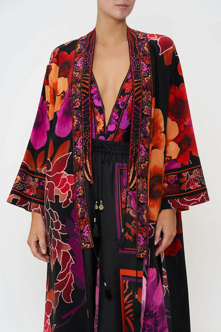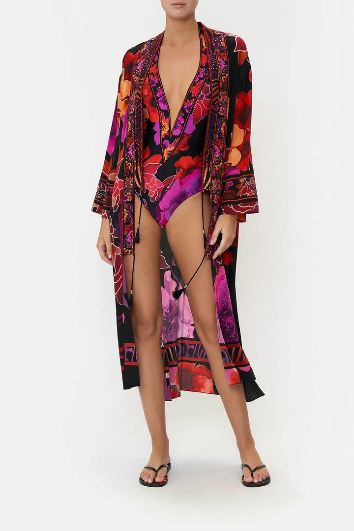 A layer of floral cascades for lovers of excess, the Midnight Poppy Long Layer With Neck Bands is enveloped in a sea of midnight hues defined by poppies blooming in shades of crimson, burgundy and magenta. Adorning hand-embellished CAMILLA crystals, this luxury layer features a statement wide sleeves that end in contrasting panelling, black tassel accents, a relaxed maxi silhouette and neckband detailing.