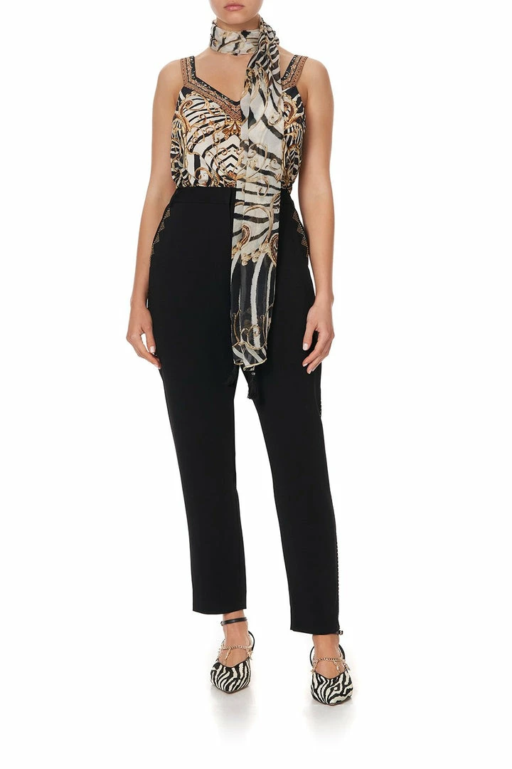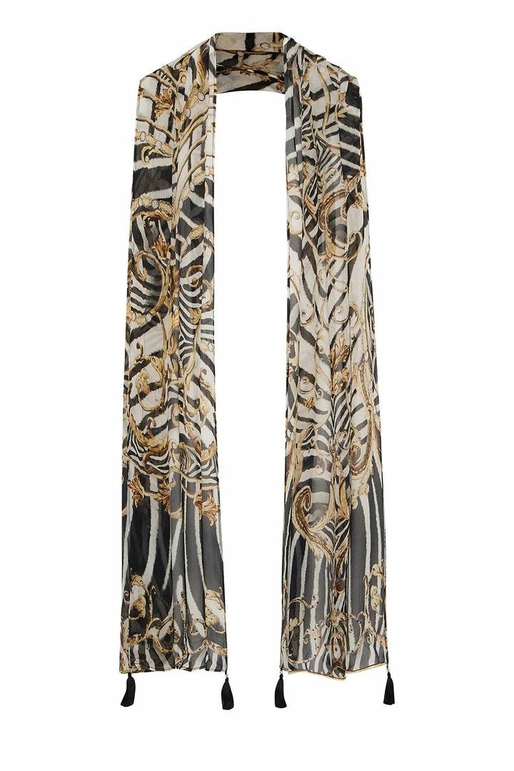 A mesmerising statement scarf awakening your inner feline, the Night Waiting For Day Long Scarf radiates hues of gold and zebra. A celebration of Grace Jones’ feminine energy and her ability to change the narrative of who and what a woman should be. This silk chiffon scarf features lavish tassels, digitally printed silk chiffon, two metres of luscious length, as well as hand-placed crystals as detail. Style as a boho turban or simplistic neck scarf.