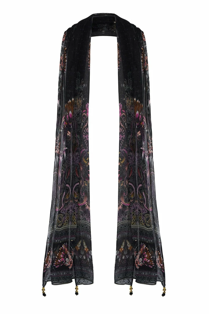 Gracefully luxurious the Restless Nights Long Scarf is the perfect add on accessory for any gala, with a pink and purple toned paisley print on a charcoal black canvas.