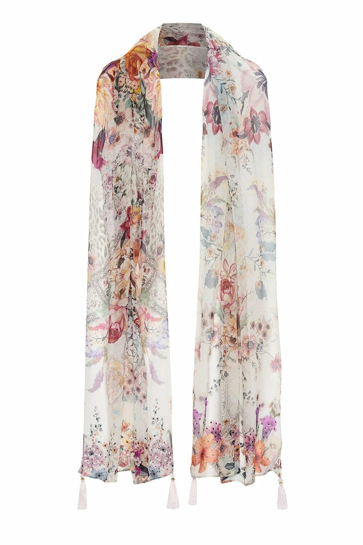Wrap yourself in florals with the Sew In Love Long Scarf. Inspired by English gardens and antique markets, this intricate print comes to life on silk chiffon, punctuated with CAMILLA crystal embellishment. Beaded tassels at each corner round off a statement scarf that can be worn to breathe new life into a simple outfit, or added to your vacation wardrobe.