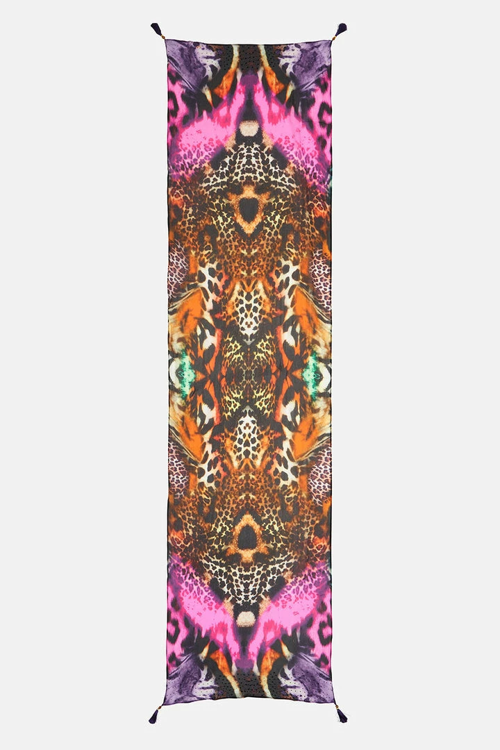 A drape of futuristic proportions for the décolletage, our Surrealist Suspension Long Scarf explores a concoction of vibrant magenta, animal print and soft moments of teal. Finished with hand-applied crystals, this luxury silk scarf features signature CAMILLA embellishment, soft amethyst tassels and a multi-wear style. Drape from the neck to elevate your every day or lay it across the elbows for the most opulent of occasions.