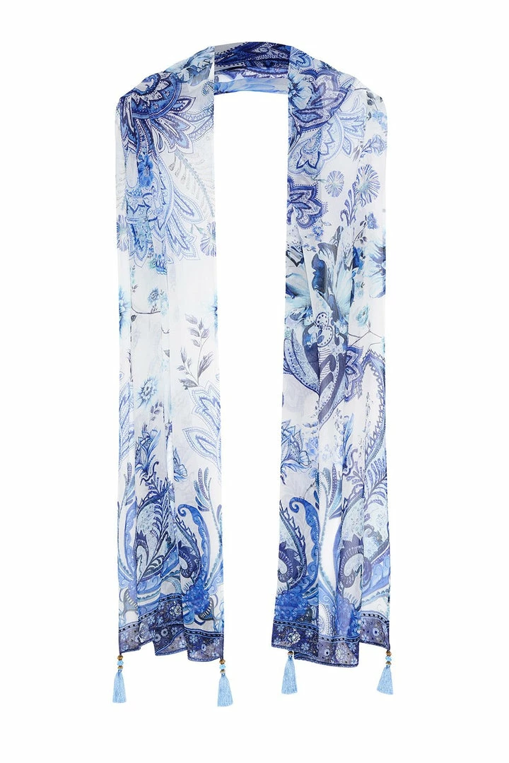 A dreamy and decadent paisley print across a statement scarf, our Talking About A Revolution Long Scarf is where bright blue and crisp white paisley swirls across a silken canvas. Style as a boho head wrap or simplistic neck scarf.
