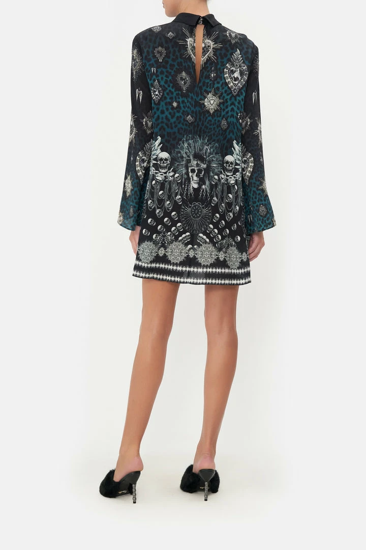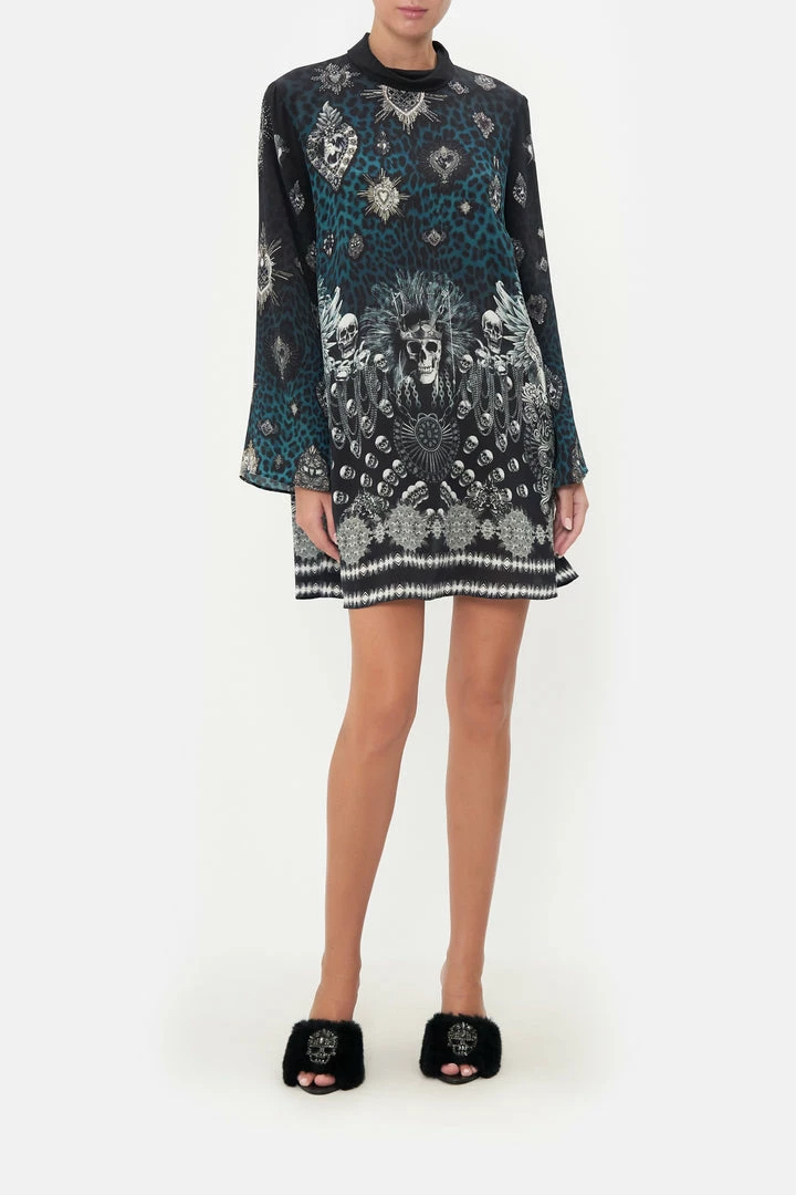 Dipped in a homage to the richness of Mexico, the Animal Anarchy Long Sleeve Swing Dress is wrapped by rich emerald leopard print adorning the intricacies of ivory skulls, metallic amulets and silver-dipped hearts. Adorning hand-embellished CAMILLA crystals, this luxury shift dress features a high neckline, a flared statement sleeve, a relaxed silhouette and a cropped hemline.
