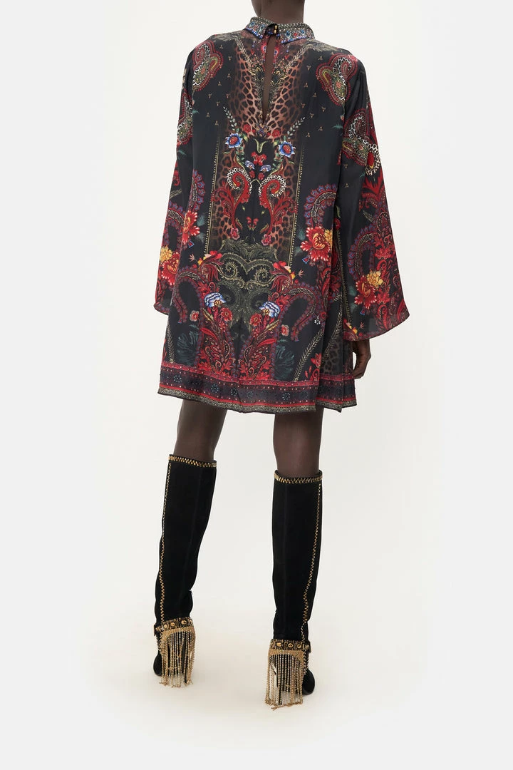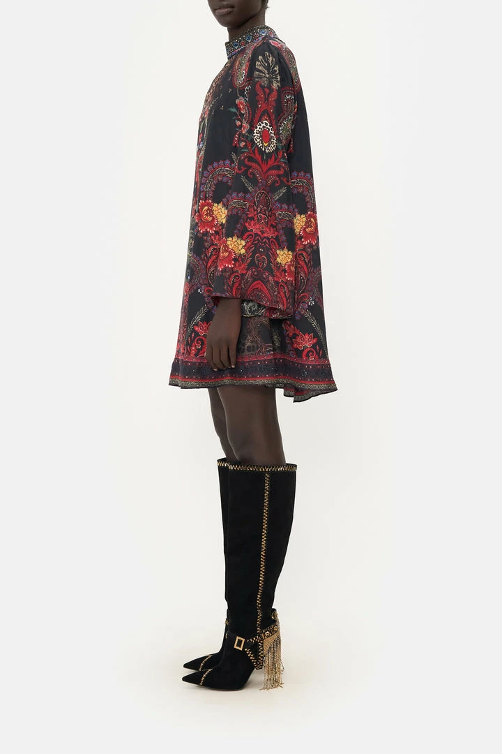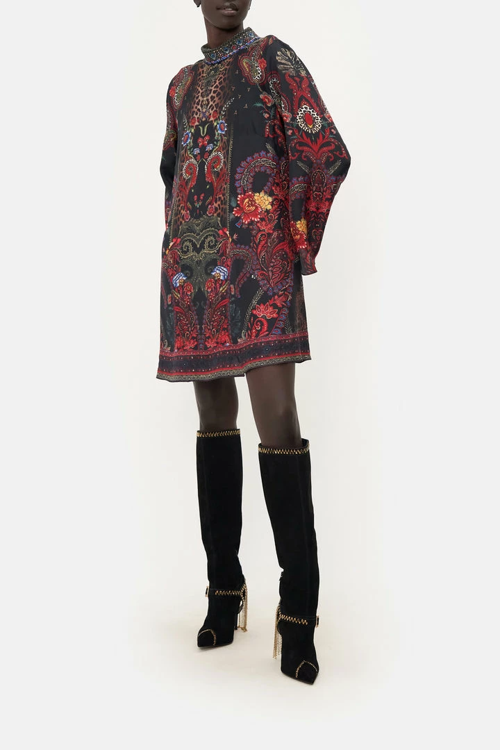 Oozing seventies decadence with a touch of grunge, the Woodstock Rock Long Sleeve Swing Dress captures the gaze with burgundy paisley indulgence, pops of deep crimson and moments of midnight hues. Crafted from signature CAMILLA silk, this luxury dress features a high neckline, a wide long sleeve and a relaxed mini silhouette that dances into a billowy flared hemline.