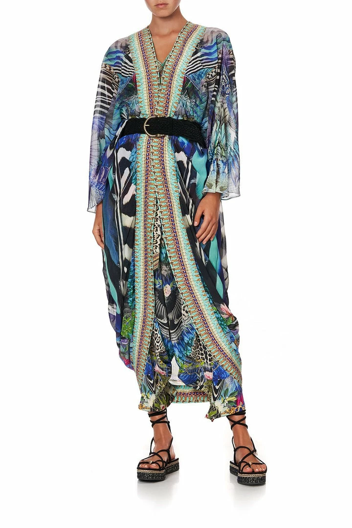 Take an opulent safari into a neon wonder-world; the Cafe Nairobi Long Sleeve Long Cape is a melange of wild wonder adorning a canvas of pure CAMILLA silk. Rich with animal prints and feather motifs, this maxi length oversized cape is finished with a contrast neckband, long sleeves and hand-placed CAMILLA crystals. Amplify the calming energy of this free-flowing layering piece and style for a relaxed aesthetic.
