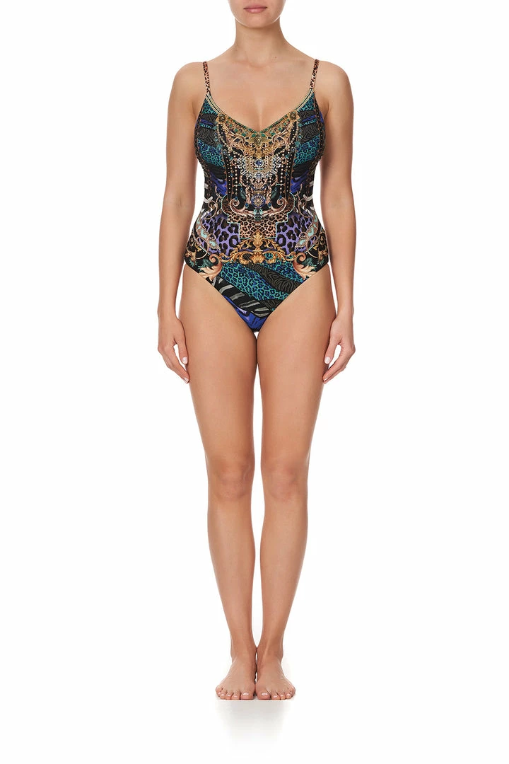 A layering piece for the print lover at heart, our She’s Got Grace Low Back Bodysuit is vibrant with accents of gold and purple. Dripping with tough, feminine energy, this piece is designed for wearing under bespoke CAMILLA products, or as a top with trousers and skirts, this all-over printed leotard style bodysuit is best suited to A-C cups and features and adjustable and convertible strap, a soft style v-neck and and alluring low v back and essential piece for any devout CAMILLA collector.