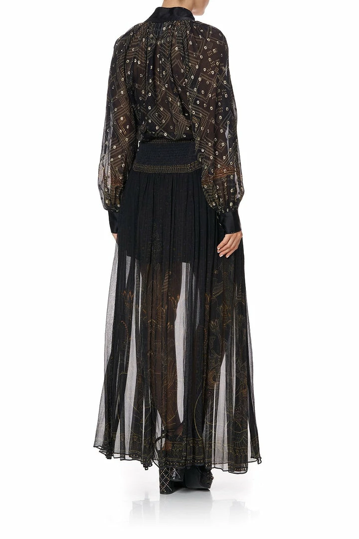 A maxi skirt billowing in form, the Cobra King Maxi Skirt with Shaped Yoke is simply mesmerising. Mused with a print referencing ancient Egyptian animals in unparalleled extravagance against a midnight backdrop, this floor length printed silk skirt features peasant-style panelling, a shaped yoke for form and is finished with hand applied crystal embellishments. Pair with bikini top for festivals, or with matching Cobra King Wrap Top for an elegant formal look.