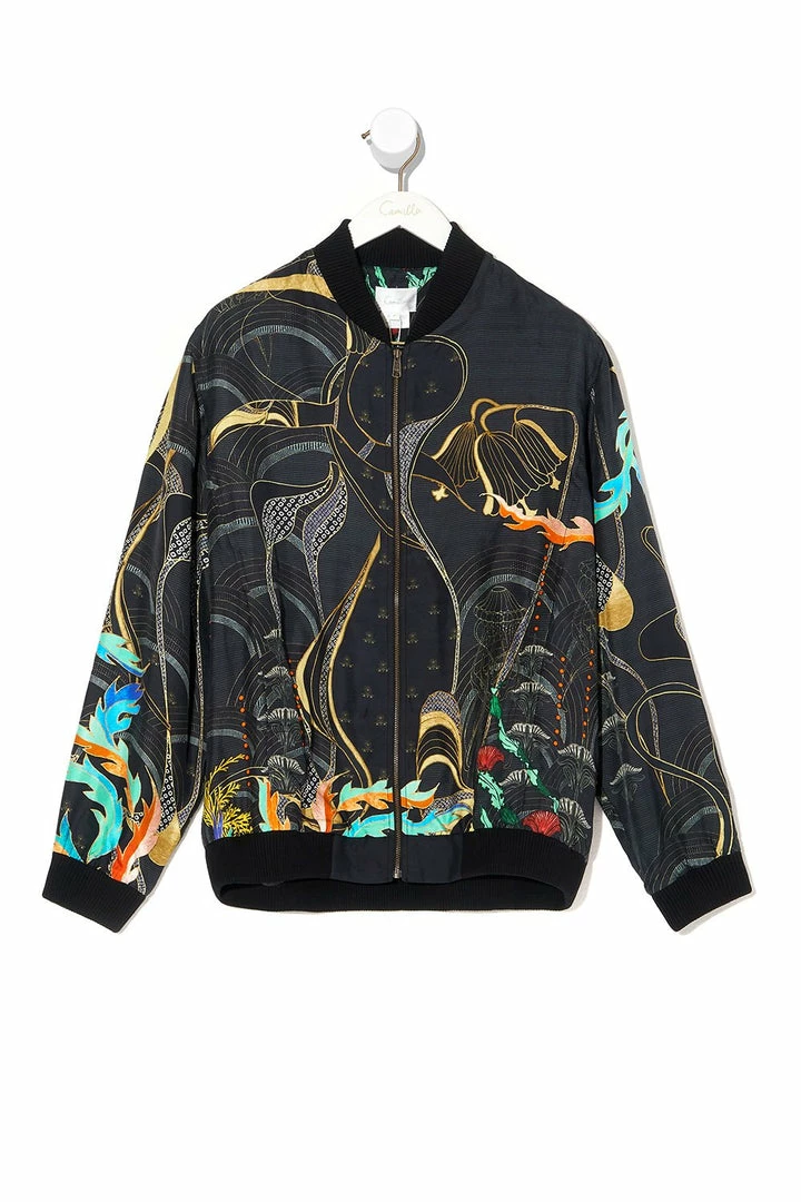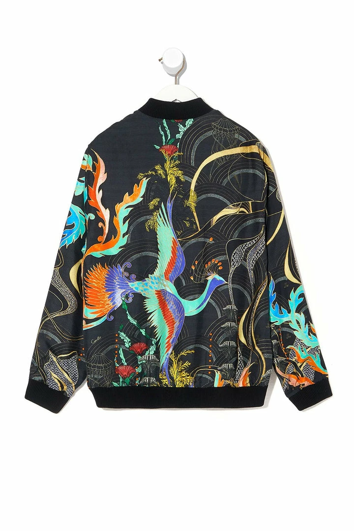 A compelling jacket for the vibrant gentleman, the Wise Wings Men’s Bomber Jacket evokes a dreamscape of colourful Persian folklore creatures during their night flight. Crafted in a soft yet structured 100% printed silk, this striking bomber style jacket is cut to form in a relaxed fit and features a blouson sleeve, printed lining and ribbed neckline, cuff and hem. A dashing wardrobe addition season-upon-season, pair back with matching Board Shorts for a head to toe outfit.