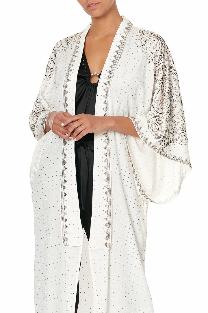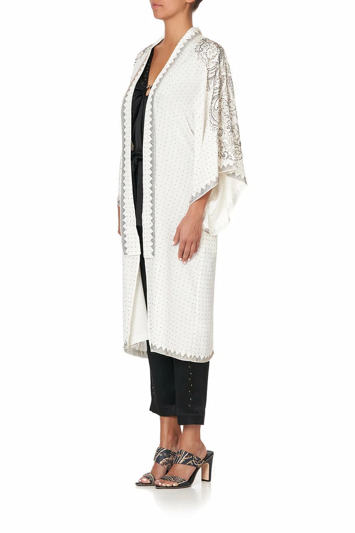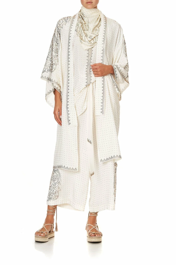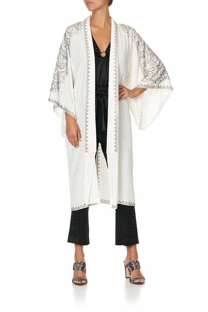 A dazzling display of bohemian glamour, the Luxe Cream Mid Length Kimono Coat uses the artistry of hand-placed crystals to create this art deco inspired masterpiece. Crafted from 100% CAMILLA crêpe silk the kimono influence adds stately grandeur whilst the relaxed fit billows with movement. Pair with plain black jeans or with the Luxe Cream Lounge Trouser With Tie Waist for the perfect winter look.