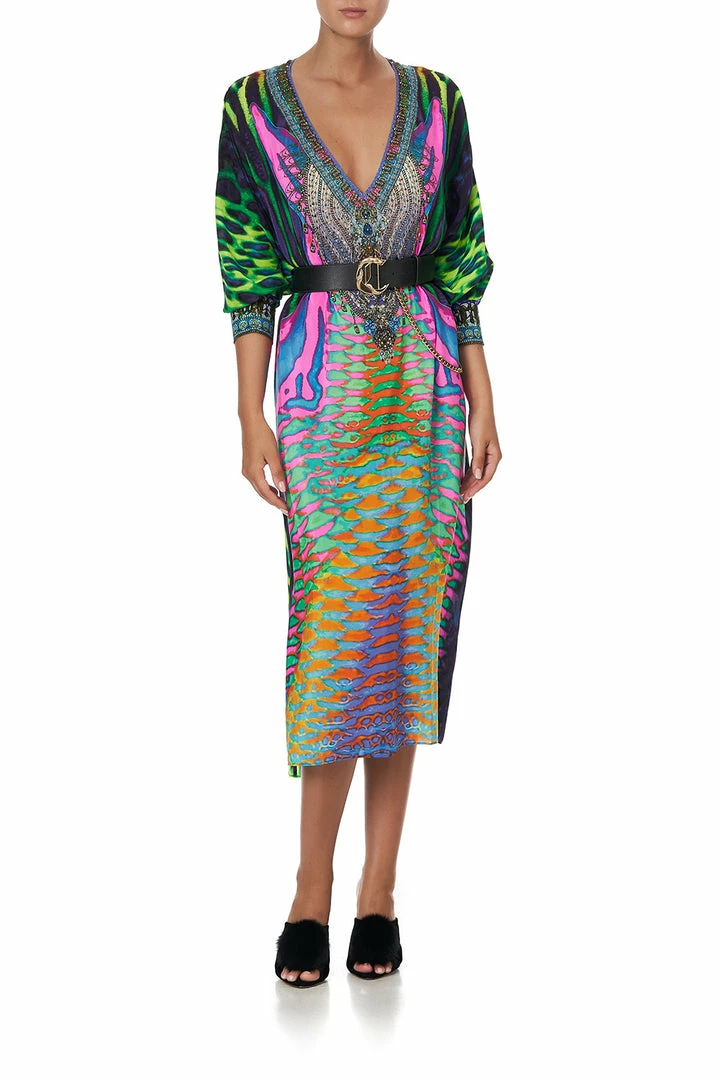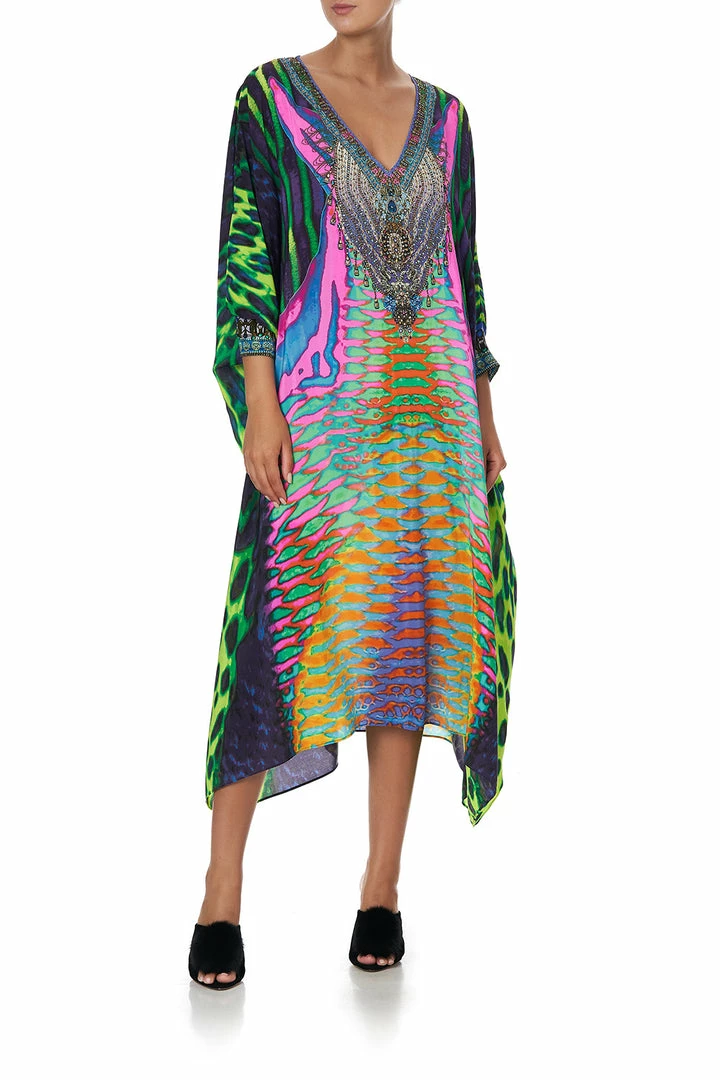 A concoction of electric hues, our Poseidons Poison Midi Kaftan With Cuff is an ode to our treasured Babylon collection, a reflection of our precious CAMILLA beginnings and seasons past. Snakeprint is brought to life in hues of tangy green and fiery orange while tiger stripes meet bold neons and bubblegum pinks. Crafted from silk, this statement kaftan features a crystal amulet, a shaped handkerchief hemline and a relaxed midi silhouette that dances just below the knee. Style with the decadent Slipper.