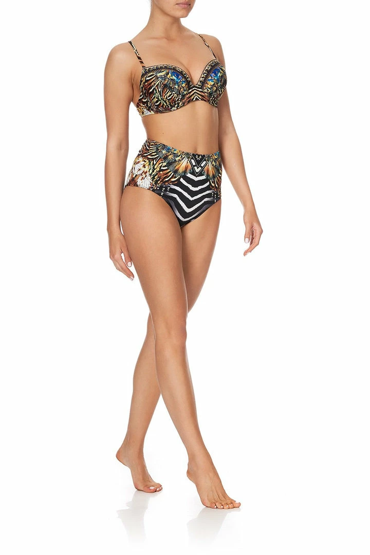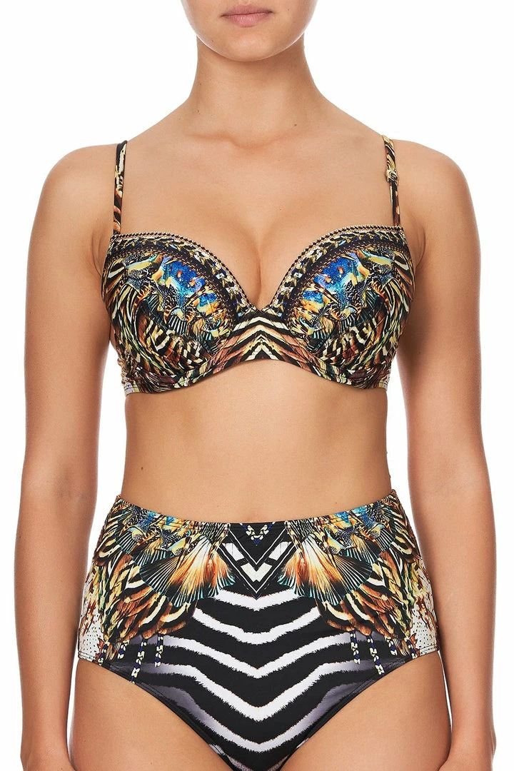 Intricately printed swim top, the Lost Paradise Moulded Plunge Bra exudes luxe elegance with dark tones and pops of vibrant coral for a sultry tropical statement look. This supportive underwire bikini top is crafted in gentle Italian lycra and features a lush plunging neckline, adjustable printed straps, hook back closure for a custom fit and moulded crystal-studded cups to fit a C-D Bust.
