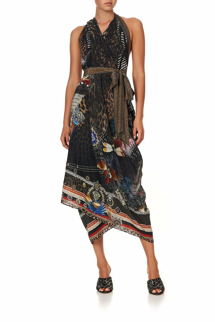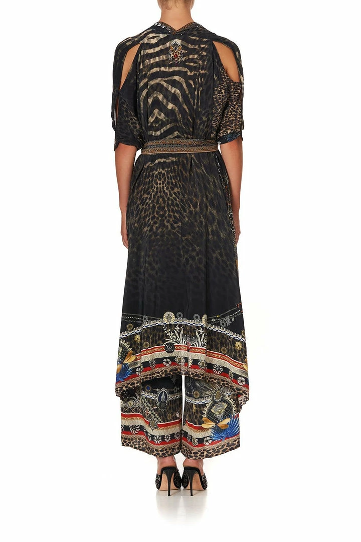 Ethereal dreams of love and light are woven into the luxe silk stylings of the Treasure Chaser Multiwear Draped Layer. Rock trinkets and vibrant emblems of freedom dance carefree across the rich melody of animal prints. Inspired by a rock-and-roll starlet free of inhibitions, this versatile layer promises a plethora of opportunities to dazzle in. Cut in a full-length, with split sleeves and open front, this kimono style silhouette can be worn as a dress or robe, with or without sleeves or as an asymmetrical maxi. A separate belt adds shape and style whilst hand-placed CAMILLA crystals glisten in the spotlight.