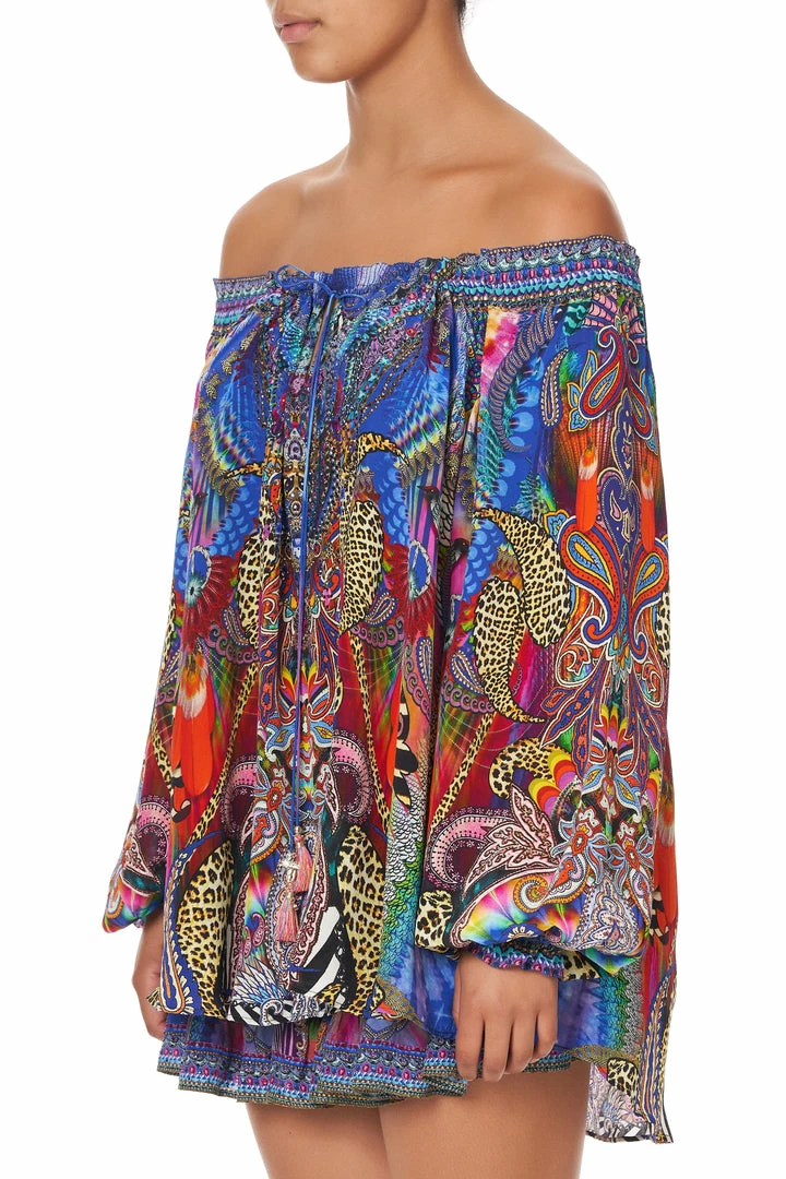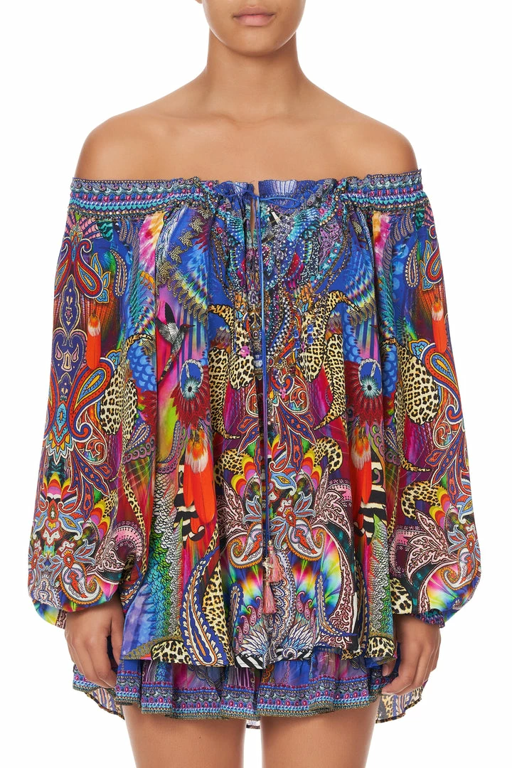 Brimming with playful contradiction, the Psychedelica Neck Tie Gathered Blouse sees peaceful boho influences clash wildly with a cacophony of vibrant colour and daring animal print. Styled in a relaxed fit with blouson sleeves and neckline ties, this quintessentially bohemian aesthetic is thrown into a world of psychedelic rainbow hues and contrasting zebra print, inspired by a wild night of riotous chaos. Finished with hand-placed CAMILLA crystals, this pure silk shirt is best styled as a hero piece with jeans or leather pants.