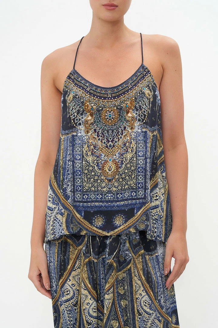 The classic camisole reimagined with ancient intrigue and soft bohemia, the Forever Family T Back Shoestring Top captivates with a deep navy hue as ornate golden details arch their way around mosaics of ethereal amulets. Adorned with hand-embellished crystal, this statement silk cami plays host to intricate back detailing, a shaped flared hemline, a relaxed silhouette and dainty shoestring straps.