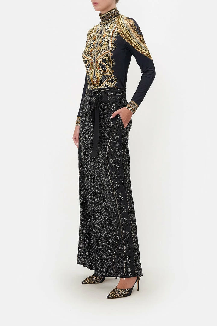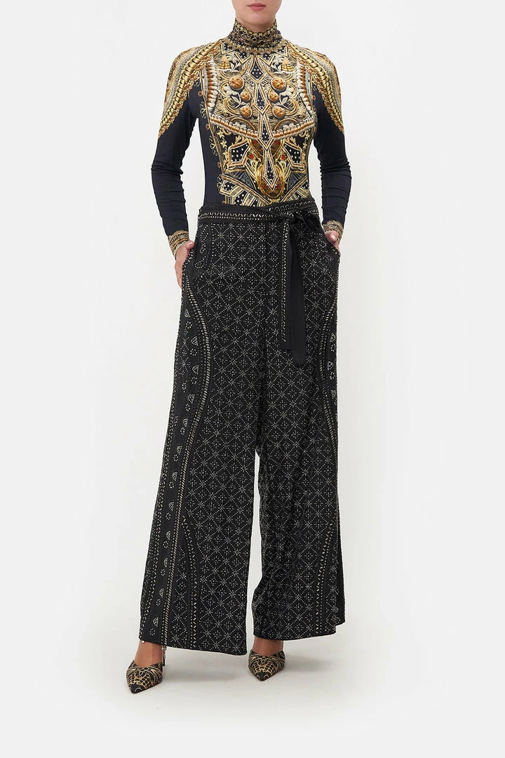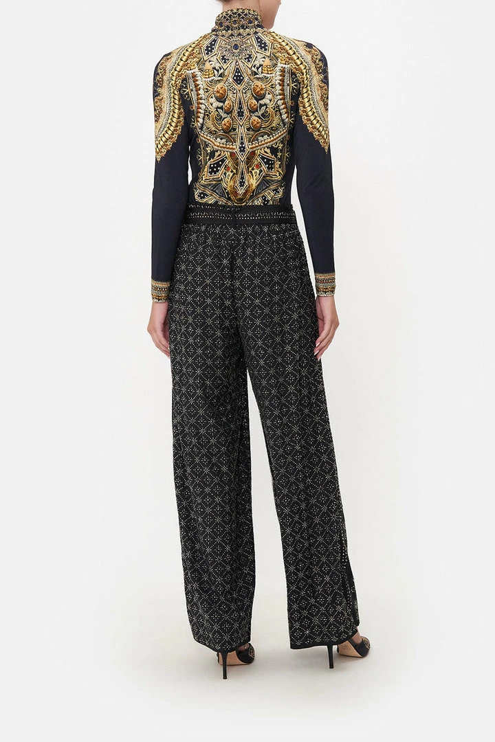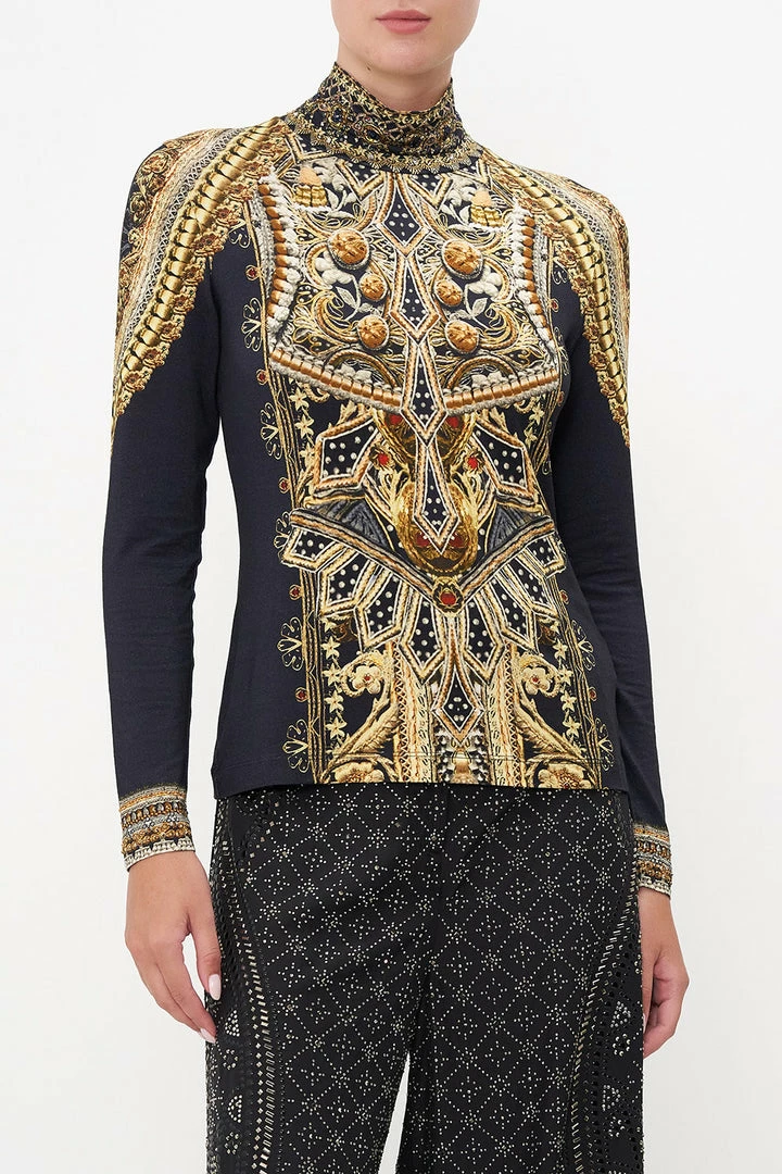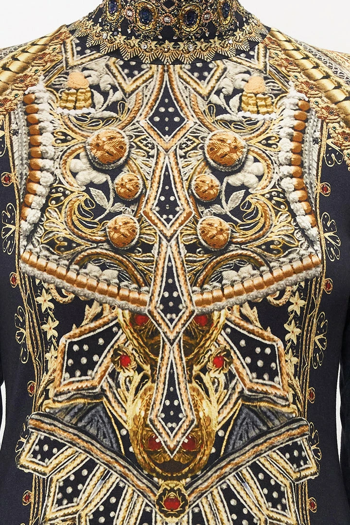 A nod to ornate details blending upon elevated essentials, the It’s All Over Torero Jersey Turtleneck is encapsulated in a deep shade of midnight as rich weavings work their way around baroque detailing and subtle botanicals. Adorning hand-embellished CAMILLA crystals, this luxury turtleneck features a full sleeve, a fitted bodice that hugs your waist and curves, a high neckline and a silhouette that falls effortlessly to the hip. Style with denim for an elevated everyday moment or pair back with leather trousers for evening perfection.