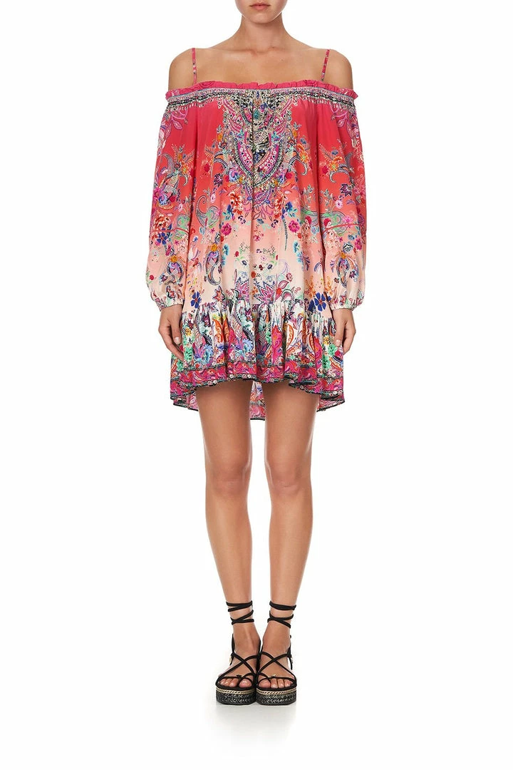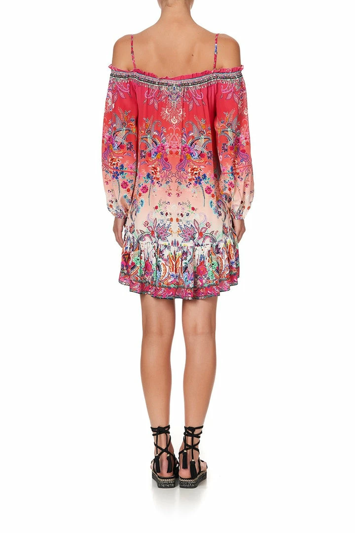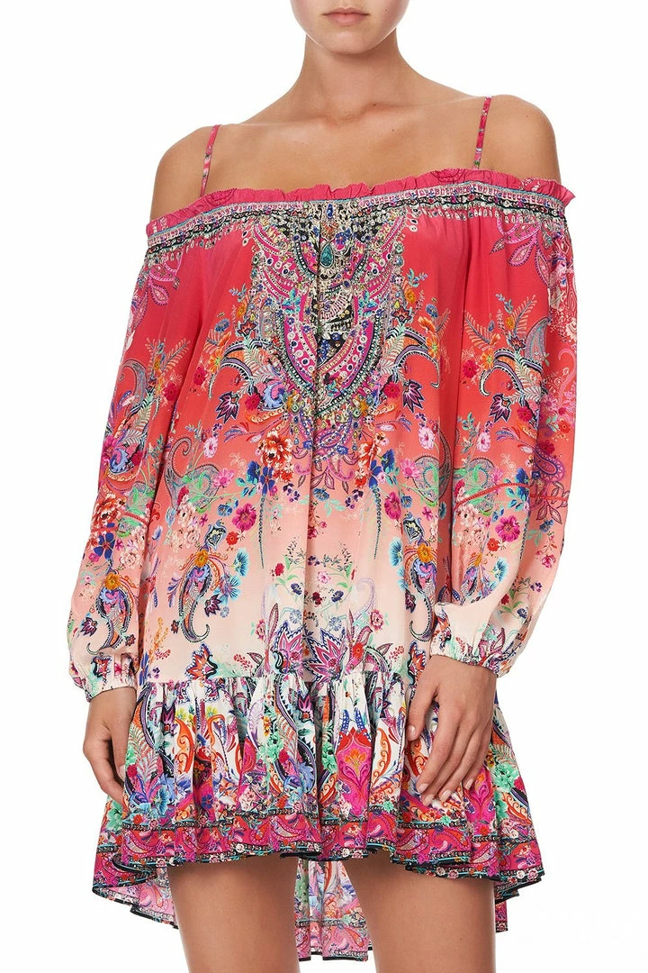 A floaty peasant style inspired by spiritual seekers of peace, the Free Love Off Shoulder Dress With Straps is cut with beautiful blouson sleeves decorated with an insert trim. Feminine lace accents the off-shoulder neckline, framed by adjustable spaghetti straps with a crystal embellished CAMILLA paisley design adorning the chest. A silk canvas of ombre watermelon shades printed with neon florals gives this silk dress psychedelic splendour. Finished with a flirty ruffle hem this is the perfect dress to wear with boots for festival frolicking.