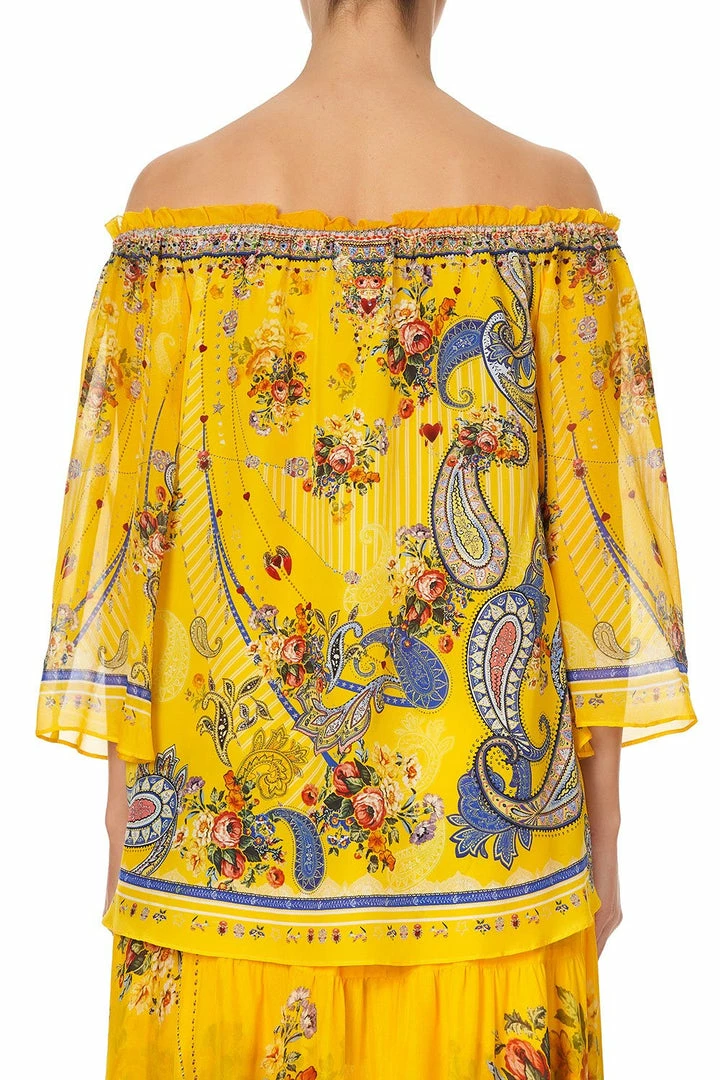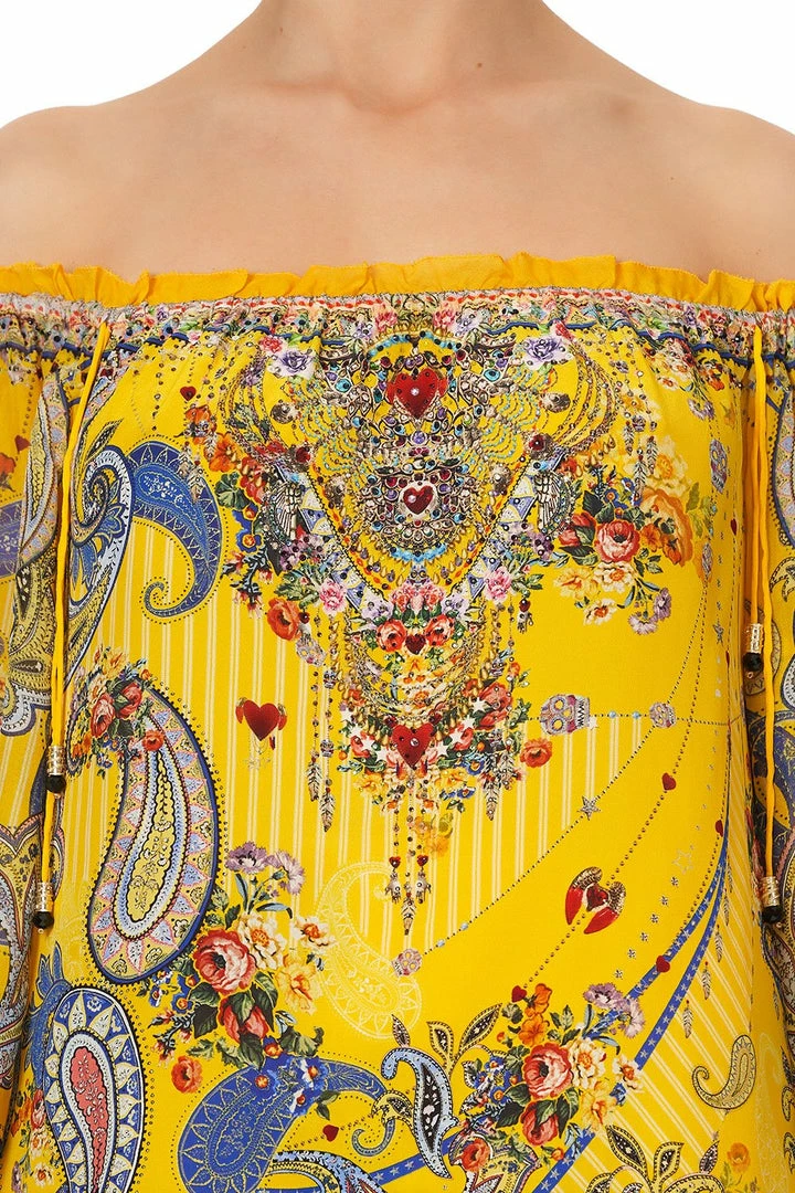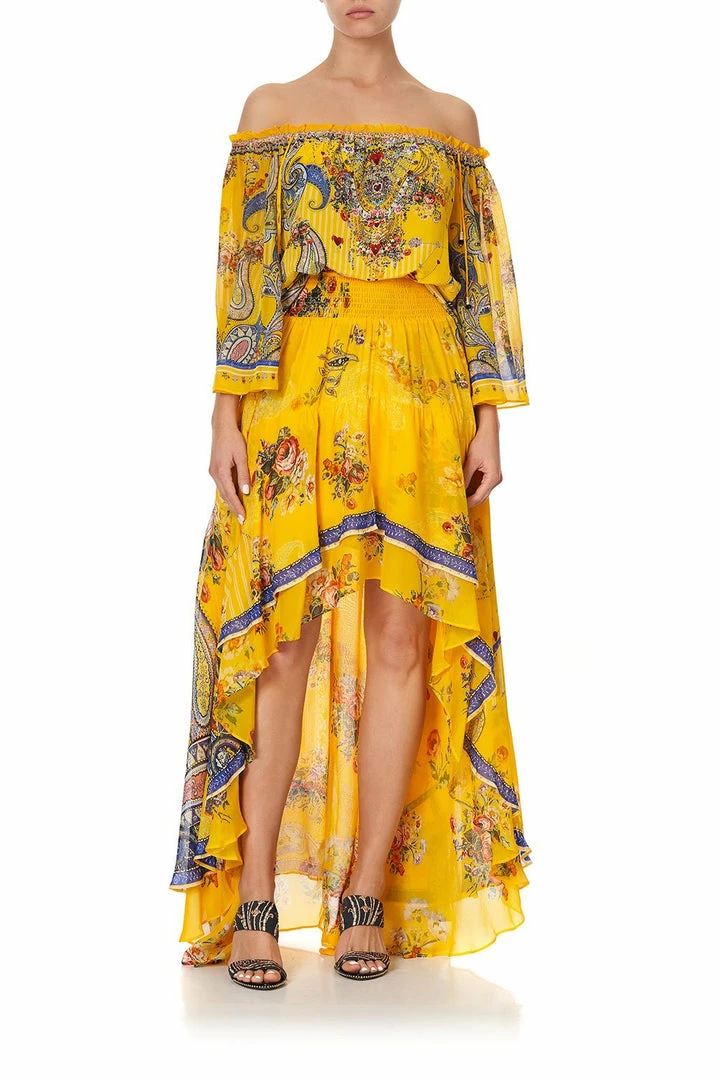 A lush silk top for the woman who is not afraid to stand out, the Own Muse Off Shoulder Flare Blouse is enchanted with blue paisley and res roses reminiscent of Frida and her iconic artwork. Crafted with a heavenly printed silk, this floaty boho top features a comfortable elasticated neckline for free movement, feminine tie details and is finished with hand applied CAMILLA crystals. Pair back with matching Own Muse Skirt With Double Layer Hem.