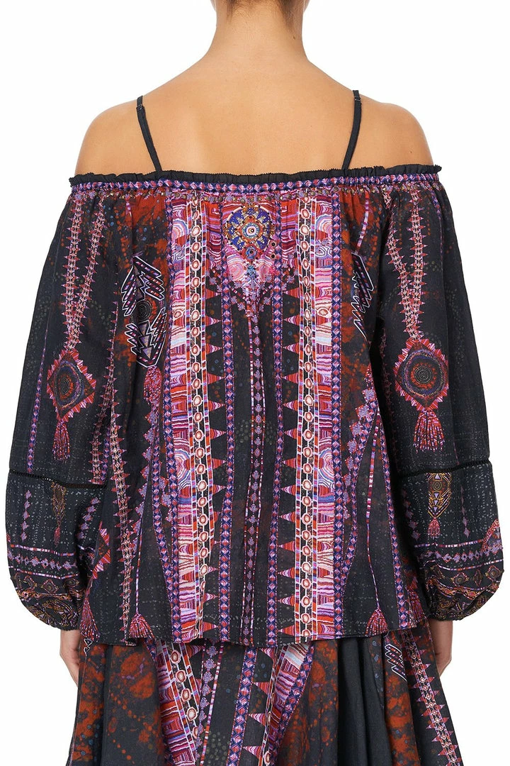 Effortlessly relaxing cold shoulder blouse, the Mina Mina Off Shoulder Halter Top is part of CAMILLA’s 15 year anniversary collection, embodying dreamtime art in a hypnotic hand painted print. Featuring an open shoulder with adjustable shoestring straps adorned with Camilla designed beading, the intricate details of laddered panel inserts and crystal embellishments compliment this oversized silhouette.