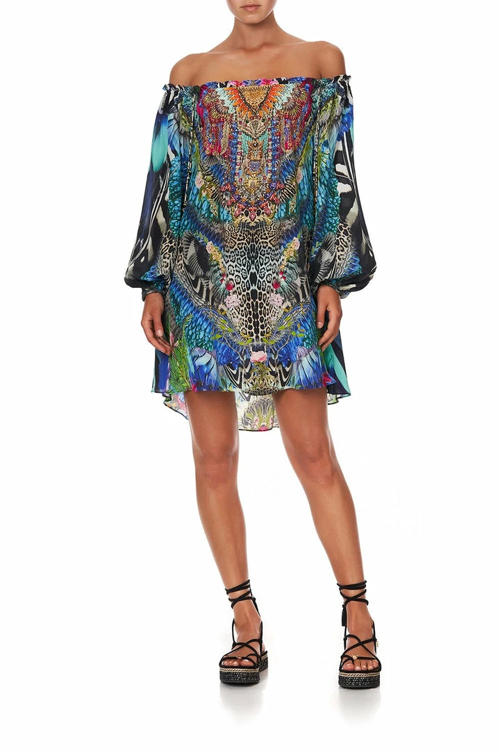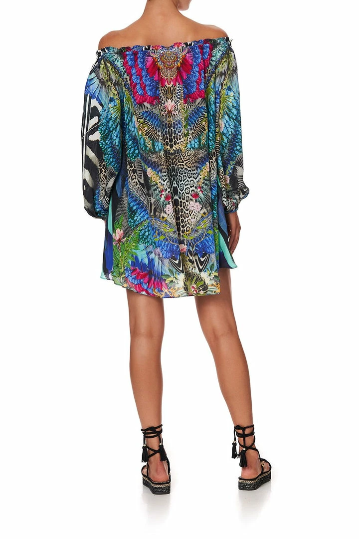 A favoured CAMILLA silhouette in an evergreen animal print design, the Cafe Nairobi Off Shoulder Mini Dress is a vivid display of wild femininity. Crafted from luxe CAMILLA silk cut in a mini length, this iconic dress shape is finished with daring bare shoulders, blouson sleeves and a dazzling herd of hand-placed CAMILLA crystals. Channel the call of the wild that inspires this neon creation and style with fierce sky-high heels for a statement summer look.