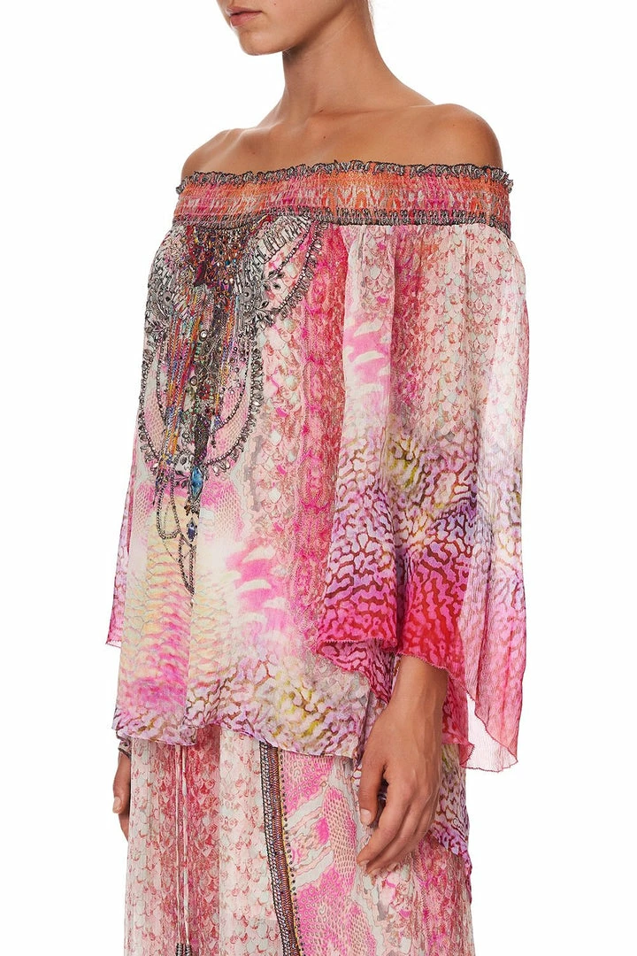 – Serpentine Dreams Off Shoulder Shirred Blouse