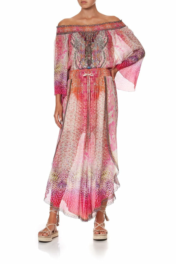 Enriched with vibrant hues of pink and orange, the Serpentine Dreams Off Shoulder Shirred Blouse takes us on a vivid safari through a neon savannah. Decorated with hand-placed CAMILLA crystals, this pure silk blouse radiates boho charm with flared sleeves, off-shoulder neckline and indulgent relaxed fit. Embrace head-to-toe wanderlust and style back with the matching Serpentine Dreams Curved Hem Pant for a vivid bohemian aesthetic.