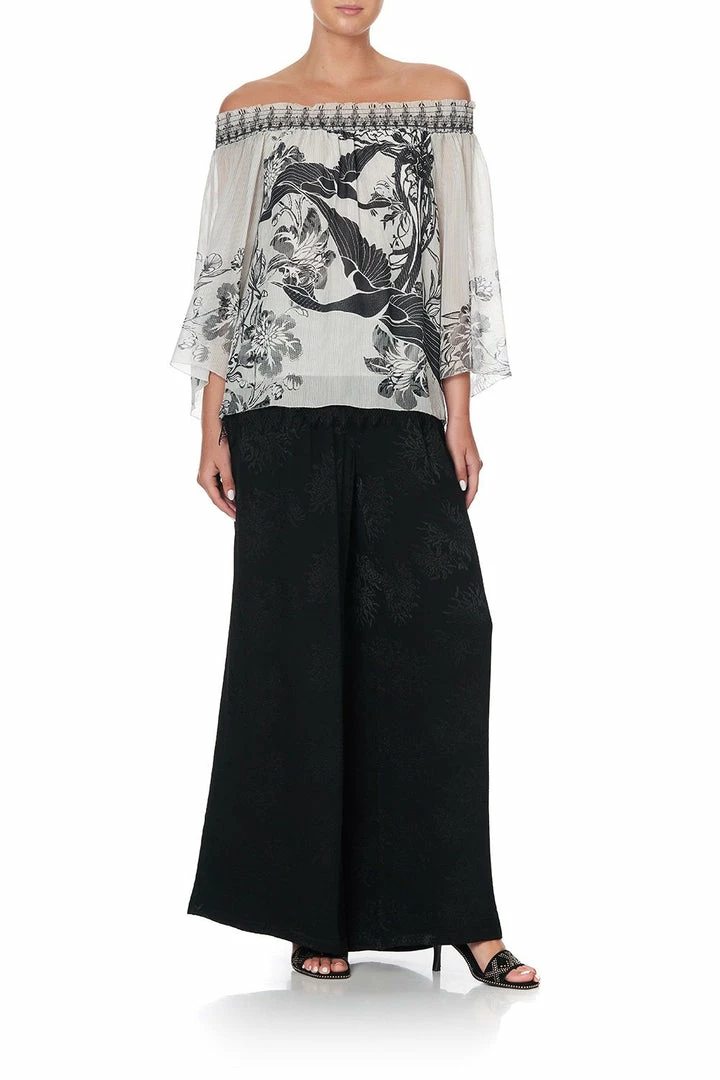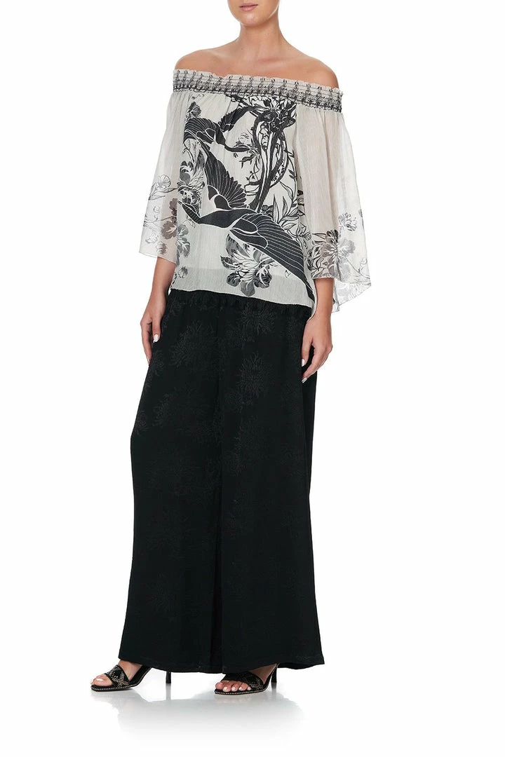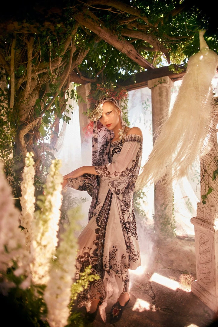 An ethereal statement blouse, the Silver Linings Off Shoulder Shirred Blouse is divinely boho. Crafted from a billowing printed silk that explores a monochromatic cinema of painted mythical birds and dainty Chinese florals, it is designed with a flared retro sleeve, an elegant off shoulder neckline and is finished with hand-applied CAMILLA crystals. Pair with the matching print trousers and a chic sandal for an effortlessly striking ensemble.