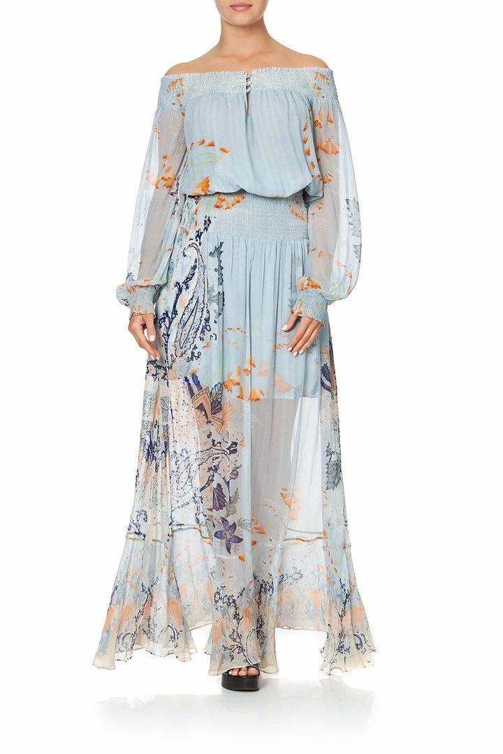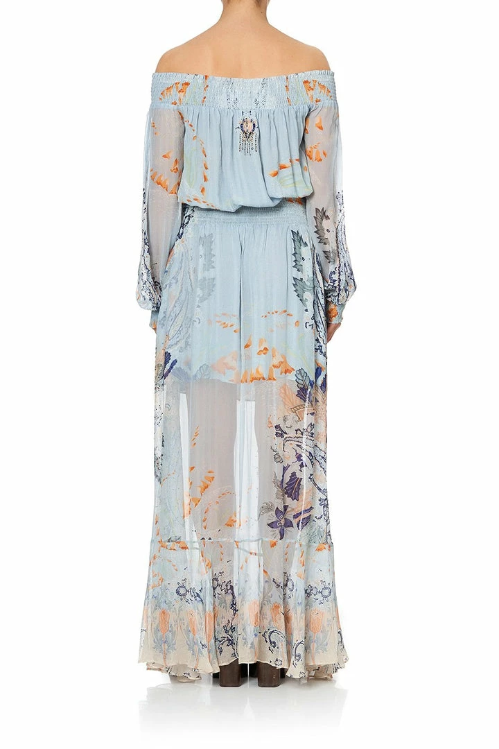 A Poetic maxi dress, the Fraser Fantasia Off Shoulder Shirred Dress – a Powder blue canvas, enhanced by tangerine and cornflower blue floral paisley, gently embraces Milla’s childhood memories on Fraser Island. Crafted in pure silk, this feminine off-the-shoulder dress features a shirred waist and neckline, button front closure, heavenly wide frilled hemline, sheer sleeves and scattered hand placed embellishments for a luminous shine.