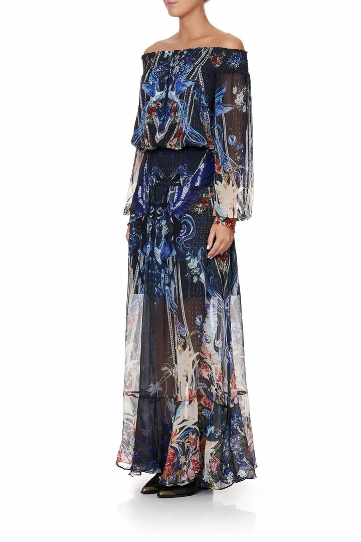 The enigmatic opulence of mesmerising hand painted folklore, the Mare Mystique Off Shoulder Shirred Dress is a stunning luminescent maxi dress inspired by the Hungarian Fairy Tale John Valiant. The dark blues print is accentuated through the sporadic pops of divine colour throughout. This piece is crafted in a printed silk, featuring an elasticated shirred cuff, waist and neckline, button close front and hand placed CAMILLA crystal embellishments. A seductive and eloquent choice for a formal occasion.