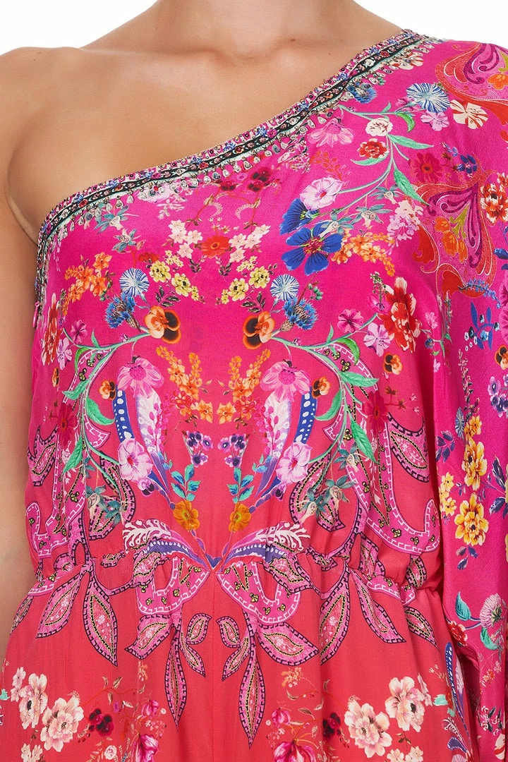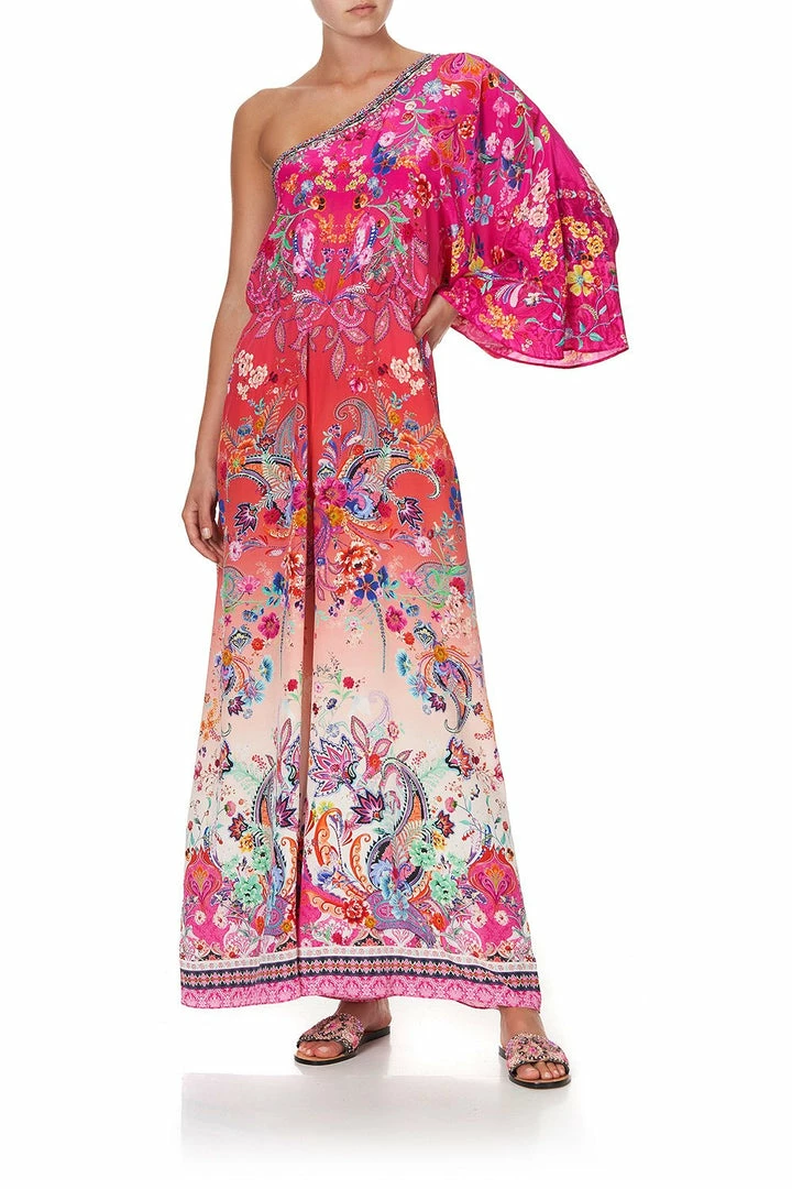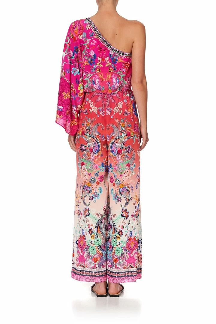 The signature piece in the Free Love collection, the Free Love One Shoulder Flared Jumpsuit is a statement style for lovers of colour. Inspired by peace, love and happiness this supreme vision of bohemian formal wear embodies a summer of love spirit for free thinking flower children. Embellished with crystals this pure silk jumpsuit has an elasticated waist, floaty ¾ length left sleeve and is decorated with an ombre paisley pattern finished with flared pants complete with contrast border. Amplify the hippie vibe of this luxe jumpsuit and wear with shining, gleaming, streaming hair.