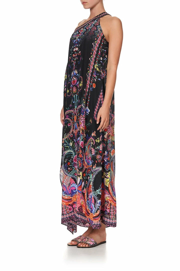 A versatile design captivated with mystic crystal revelation, the Bohemian Rebellion One Shoulder Kaftan With Neckband is a full-length style mesmerised by psychedelic anarchy. A black silk canvas is cut with side splits and decorated with a freewheeling neon paisley design and hand-placed CAMILLA crystals. Crafted from pure silk with an asymmetric neckline, this graceful style can be worn as a sleeveless streamlined dress or with its generous right-hand sleeve flying in the breeze for a more resort style aesthetic.