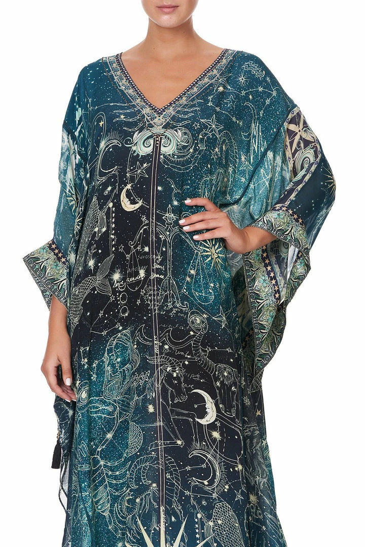A glorious take on our celebrated CAMILLA kaftan, the Into the Mystique Panelled Sleeve Kaftan is illuminated with scene of astrology and the meanings and lessons we take from the universe. Set against an emerald backdrop, this elevated resort dress is formed in a relaxed fit that billows with movement and features a retro v neckline, contrast panelled sleeve and is finished with hand applied CAMILLA crystals. A true vision of resort wear, swan about in this piece post swim or style with statement accessories for a formal event.