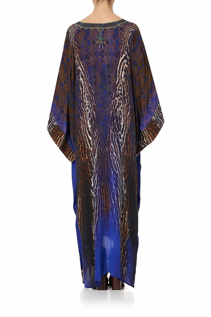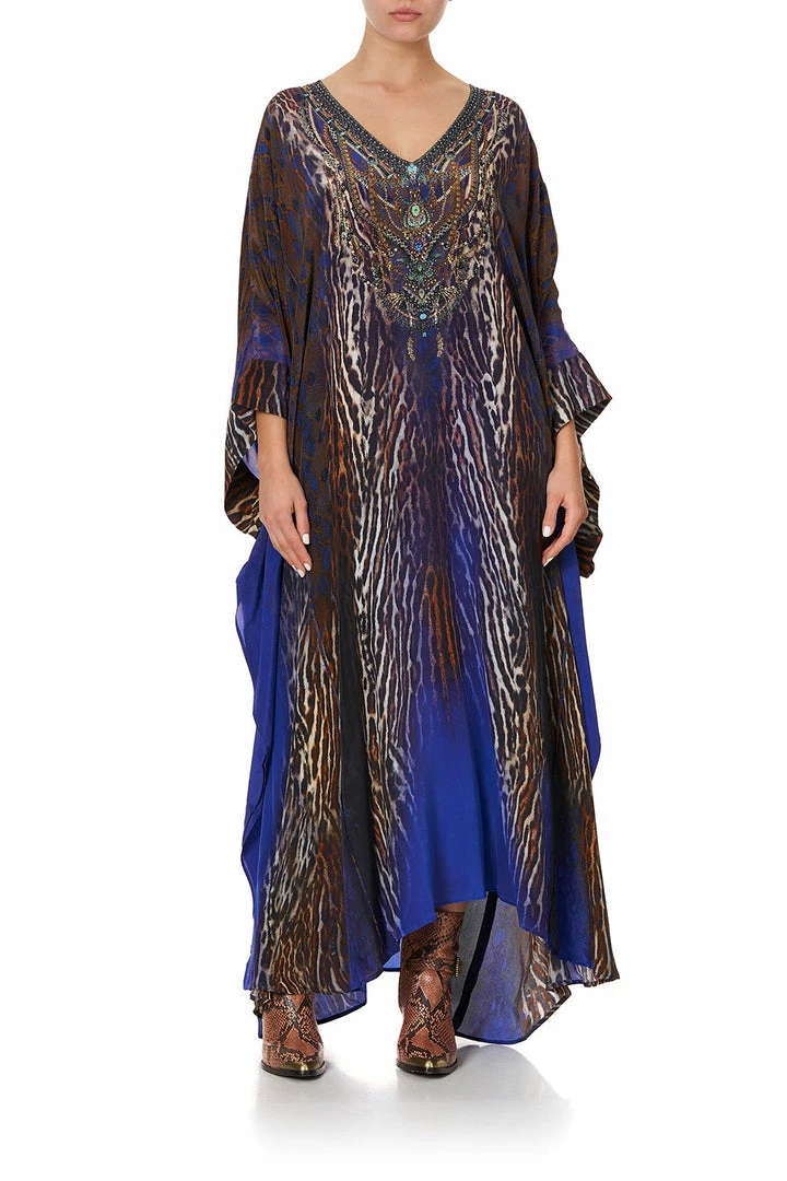 A glorious take on our celebrated CAMILLA kaftan, the Komodo Queen Panelled Sleeve Kaftan is illuminated with scene of animal print reminiscent of the dedicated work of Joan and the Komodo dragons. This elevated resort dress is formed in a relaxed fit that mesmerisingly sways with movement and features a chic v neckline, contrast panelled sleeve, finished with hand applied CAMILLA crystals. A true vision of resort wear, swan about in this piece post swim or style with statement accessories for a formal event.