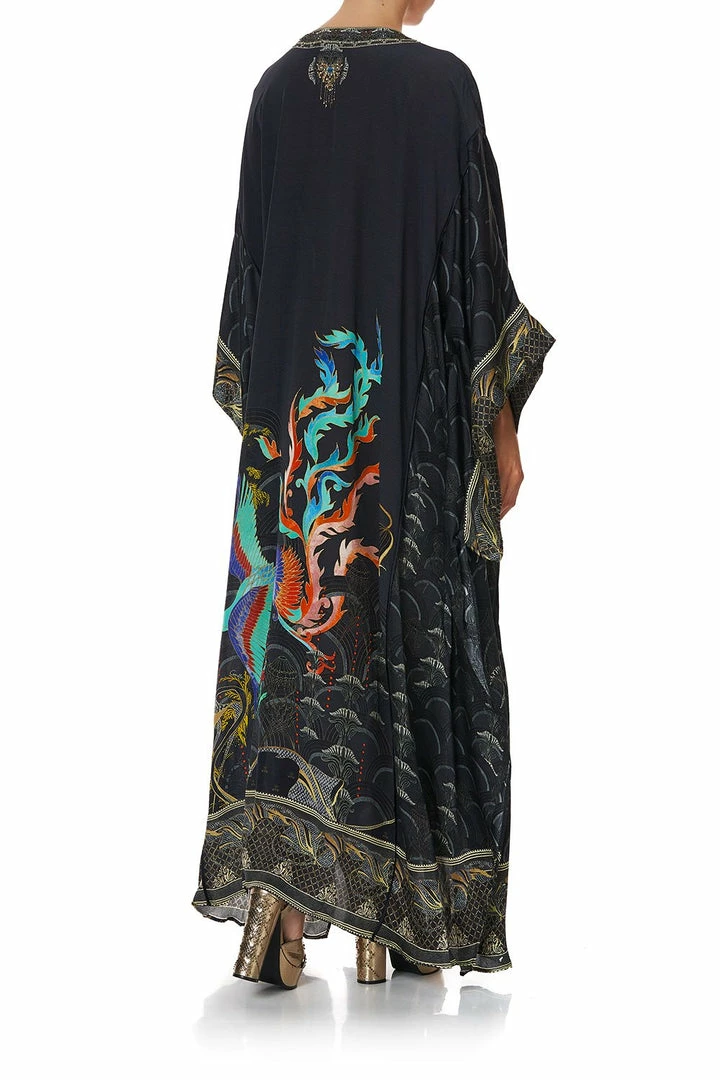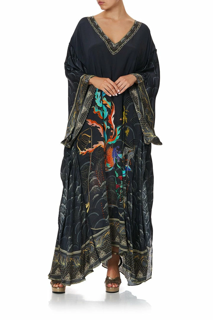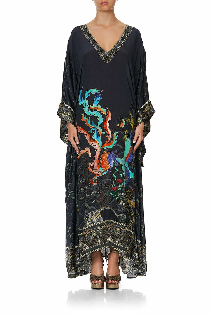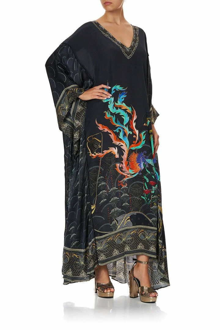 A regal take on our CAMILLA kaftan, the Wise Wings Panelled Sleeve Kaftan is luminous with hand painted elements from Persian folklore creatures during their night flight. Set against a midnight backdrop, this elevated resort dress is formed in a relaxed fit that mesmerizingly sways with movement and features a chic v neckline, contrast panelled sleeve and is finished with hand applied CAMILLA crystals. A true vision of resort wear, swan about in this piece post swim or style with statement accessories for a formal event.
