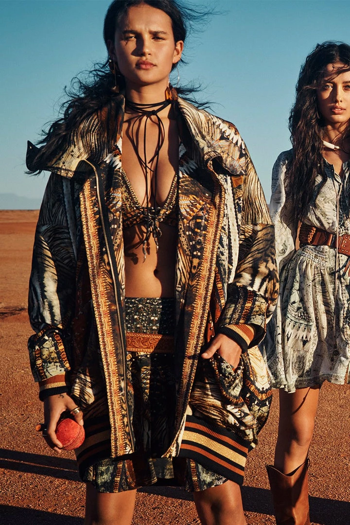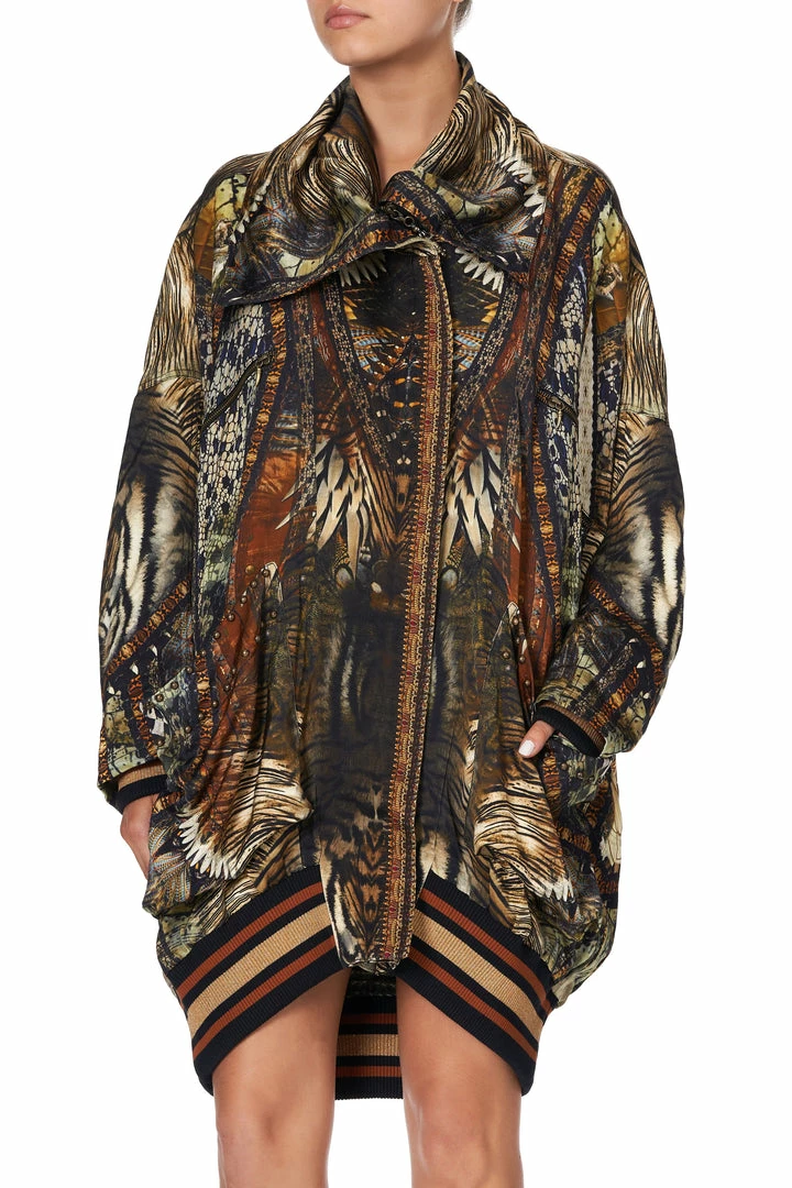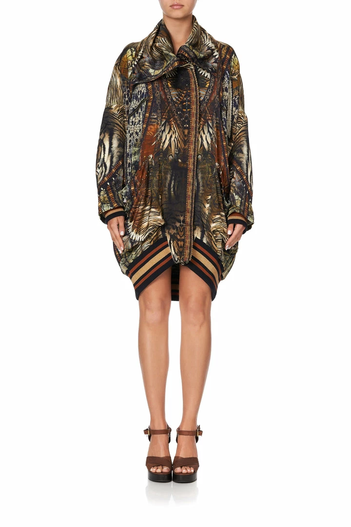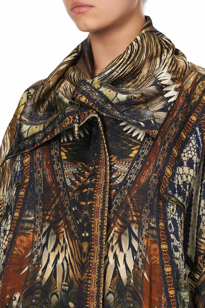 Inspired by the native wonders of Kakadu, the Kakadu Calling Parka Jacket With Rib sets the scene of the burnt horizon as we lay East of Darwin. This fully lined printed jacket features a tall collar, dropped shoulder, shaped patch pockets, as well as ribbed hem and sleeve cuffs.
