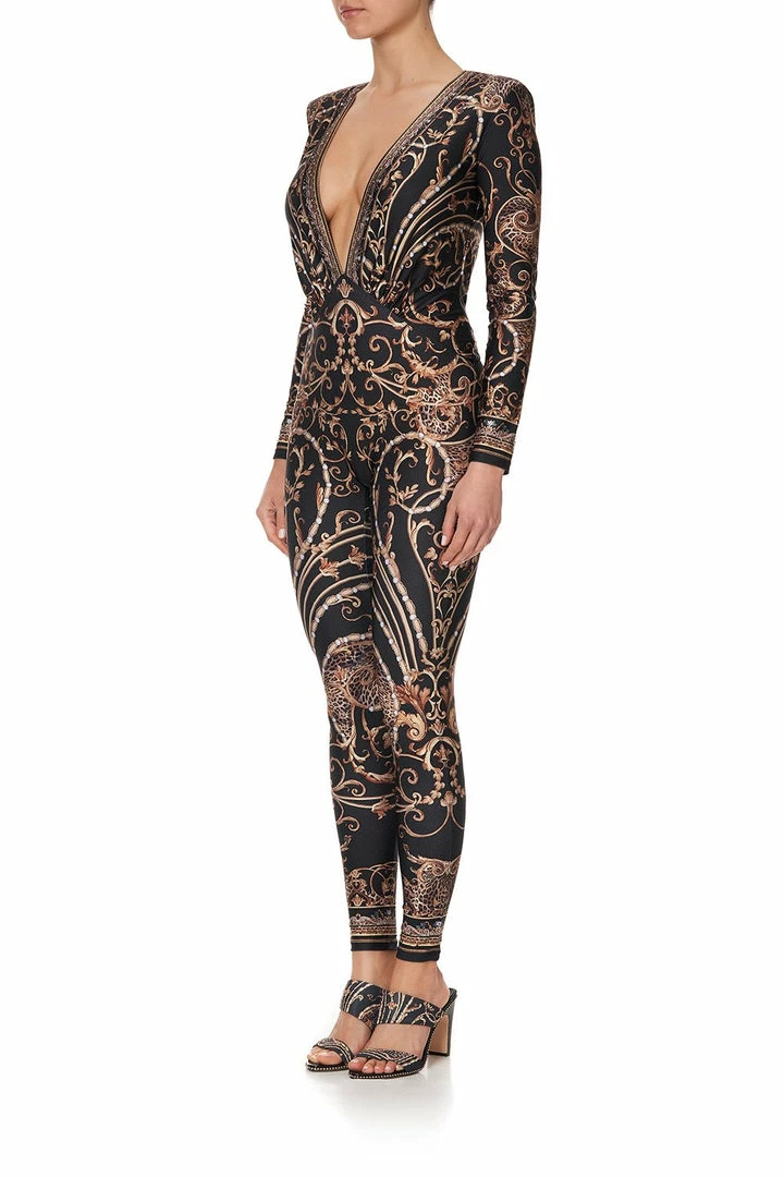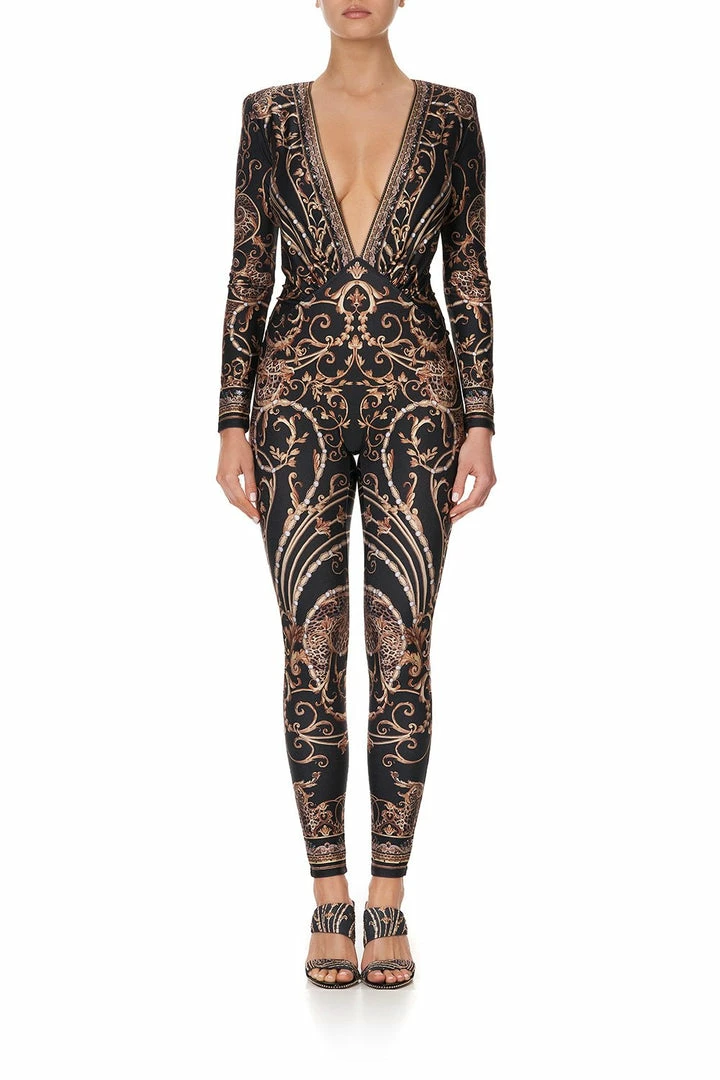 A divinely 80’s statement jumpsuit silhouette reimagined, the Studio 54 Plunge Front Catsuit embodies an effortlessly fierce woman. Crafted with a printed fabric reminiscent of Grace Jones, this feminine form-fitting one piece features an alluring deep v-neckline, fierce shoulder pad detail, fits a-c cup and is finished with hand-applied CAMILLA crystals. A statement piece for any event, opt for chunky heels for a retro vibe.