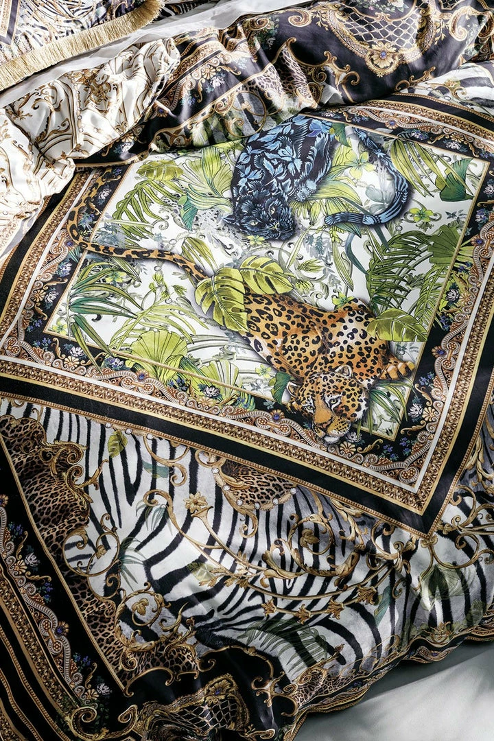 A celebration of Grace and her iconic style, the Night Waiting For Day Queen Bed Quilt Cover Set is adorned in an animal print that awakens in hues of gold and zebra, a bold palette fit for a queen. This 500 thread cotton sateen bedspread features an elegant self-tailored finish, satin-stitched borders, lavish digitally printed cotton and ornate reversible design. Style with the Studio 54 Large Square cushion.