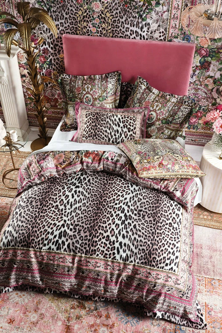 Inspired by the plush powder rooms of London’s exclusive club Annabel’s, the Anarchy At Annabels Quilt Cover Set is a sea of blooming blush botanicals and leopard print musings. Crafted from cotton, this 500 thread cotton sateen quilt cover features a luxury CAMILLA print, a self-tailored finish and a charming reversible design. Complete the set with the matching Anarchy At Annabels European Pillowcase.