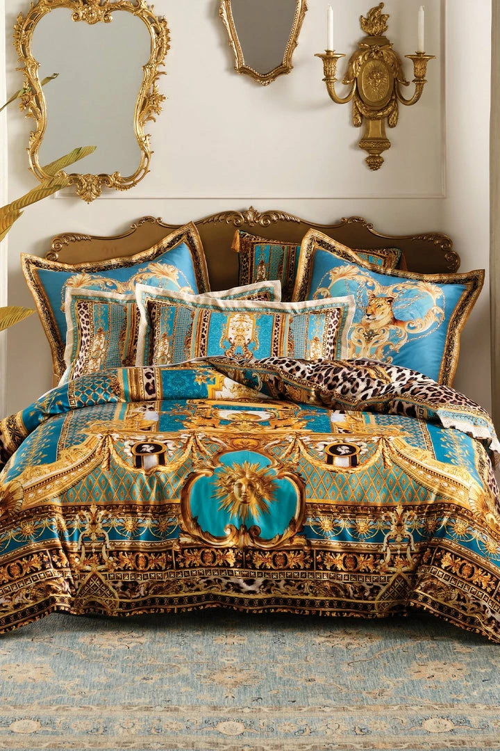 Inspired by the bold and beautiful nineties, the Dripping In Decadence Quilt Cover Set greets a leopard print that dances alongside ornate golden architecture and a vibrant blue hue. Crafted from cotton, this 500 thread cotton sateen quilt cover features a luxury CAMILLA print, a self-tailored finish and a charming reversible design. Complete the set with the matching Dripping In Decadence European Pillowcase.