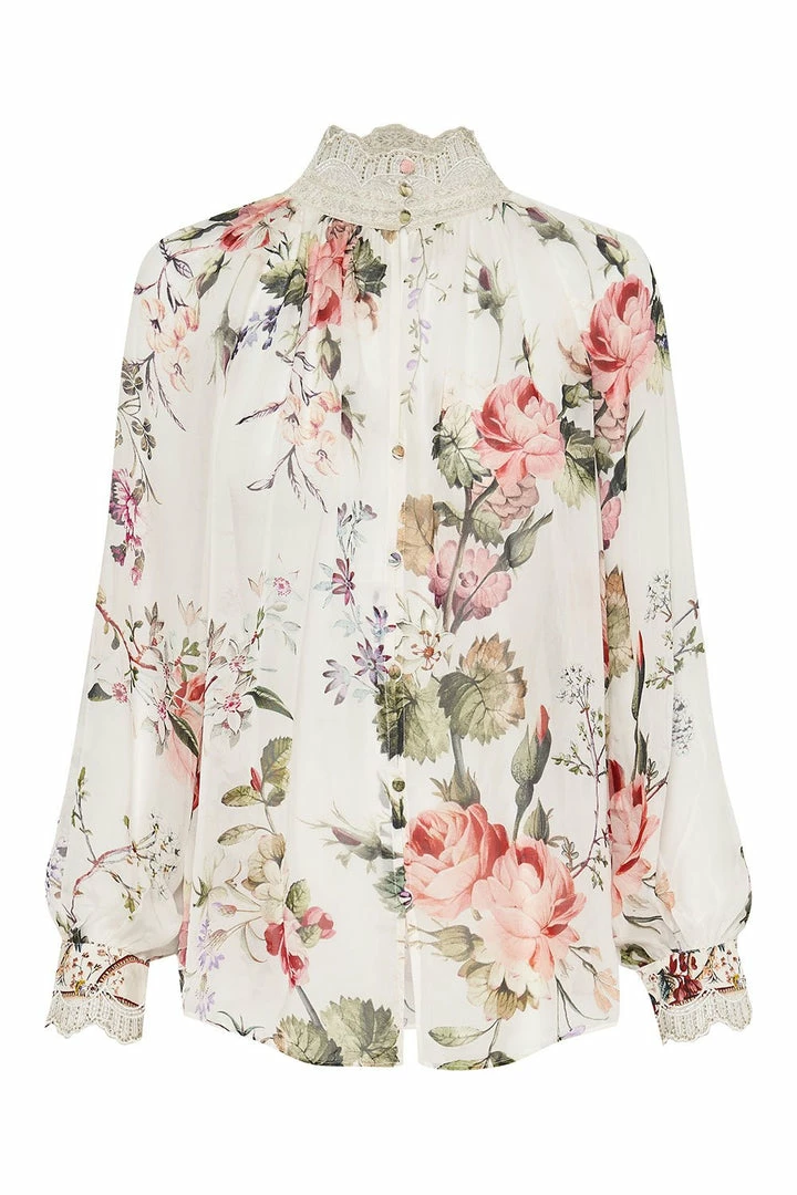 Discover that which is ethereal with our London Looms Raglan Button Up Shirt, an exclusive to our CAMILLA x The Victoria and Albert Capsule Collection. With the 18th-century works of William Kilburn as our muse, we echo his floral displays in the way of soft peonies and lush greenery. Ivory silk sets the scene for lavish blooms in delicate pinks and pistachio hues. This romantic blouse plays host to lace embroidery at the neckline and cuff, blouson sleeves that drape to the wrist and reflective hardware that ties it all together. Finish off the look by matching it with the Paperbag Waist Wide Leg Pant.