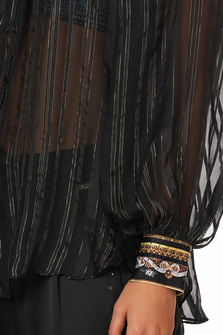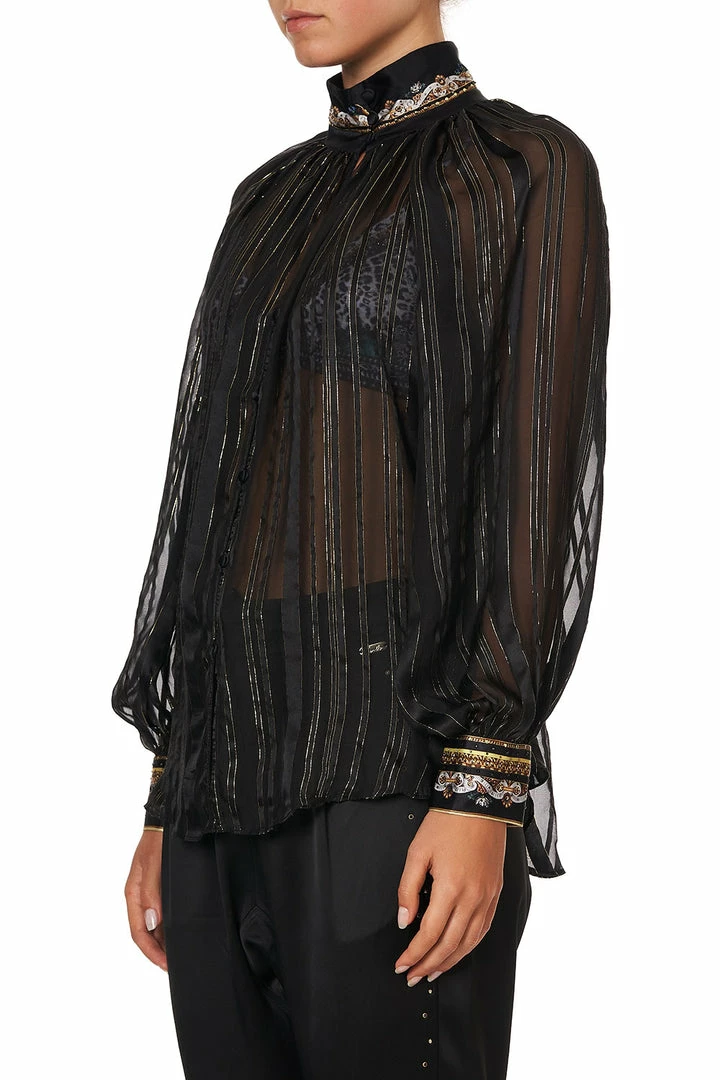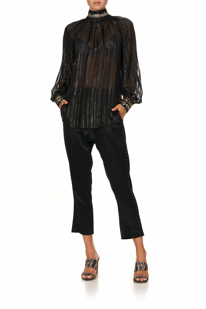 A bold black statement blouse radiant gold line work, the Studio 54 Raglan Button Up Shirt honours the feminine energy of Grace Jones in the 80’s. Crafted in an opulent printed CAMILLA silk, this semi-sheer blouse features boho blouson sleeves finished with chic button cuffs, a striking high collar and gold dot work. We love to style with leather trousers.