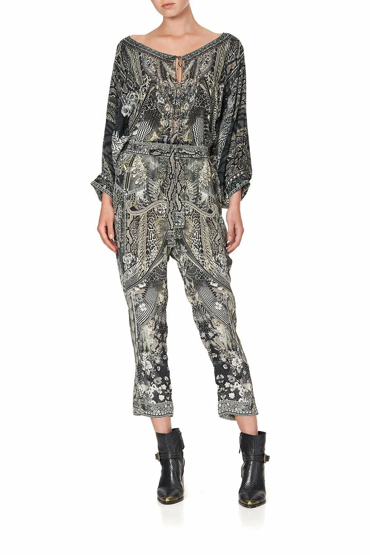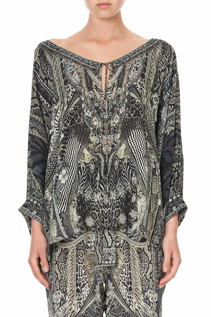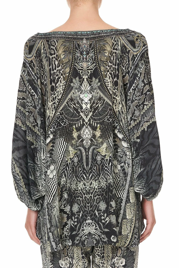 Cut in a relaxed peasant style, the One Tribe Raglan Sleeve Blouse With Cuff is a silk statement blouse rich with delicate animal prints inspired by the mystic Serengeti. CAMILLA silk in hushed tones is crafted into blouson sleeves whilst a keyhole detail at the front adds intrigue. Style with the One Tribe Drop Crotch Slim Leg Pant for a layered boho look.