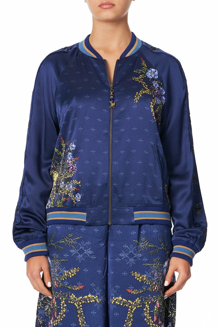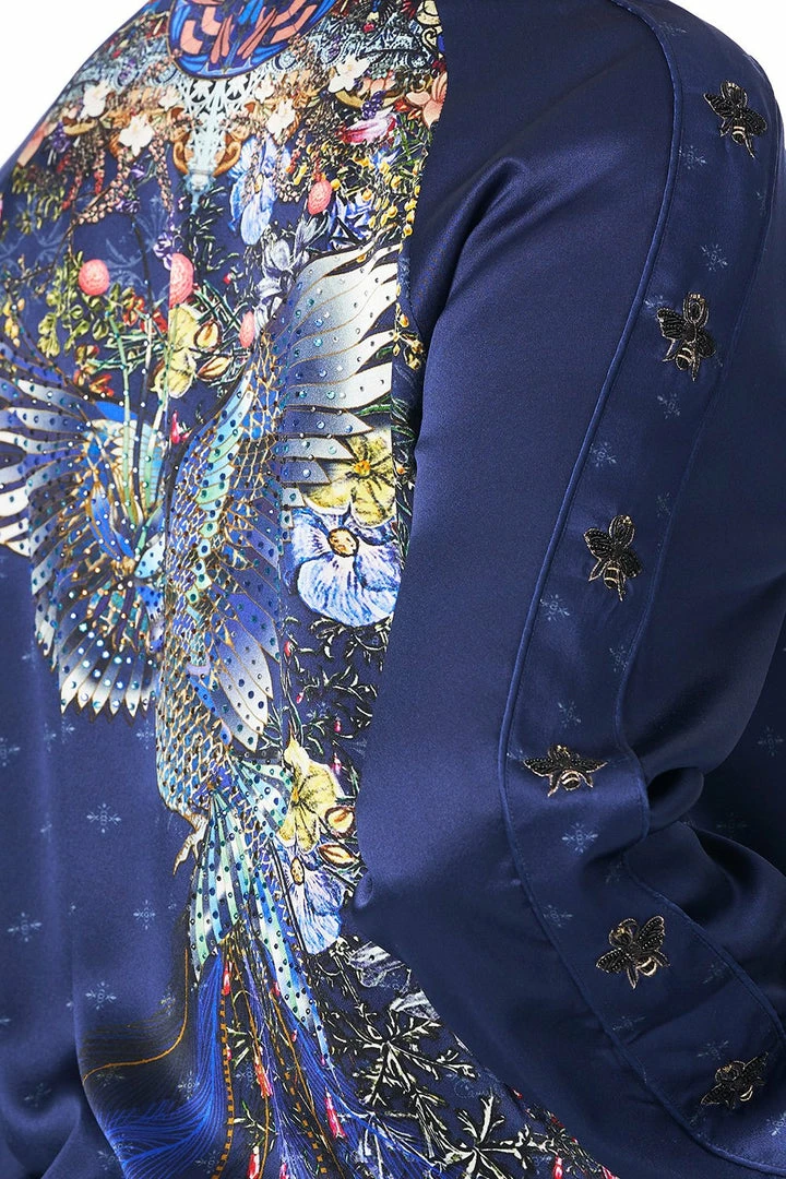 Paying homage to scenes of country Australia and the native wild birds that soar across the navy night sky – the Southern Twilight Raglan Sleeve Bomber Jacket oozes lush opulence. With dark navy hues, this printed jacket is fully lined for comfort and features digitally printed silk, delicate hand embroidery, as neckline crystals as embellishment.
