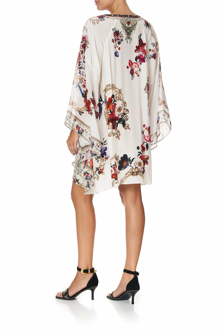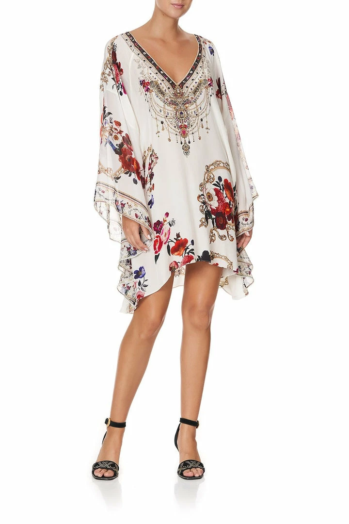 A whimsical resort dress cut to form in a celebrated 70s silhouette, the Fairy Godmother Raglan Sleeve Flared Kaftan is a mesmerising statement piece enchanted with accents of fairytale magic. Crafted in a striking hand-painted print inspired by a bouquet of florals blooming against a fanciful cream back drop, this whimsical kaftan features an alluring v-neckline, floaty wing-style sleeves that ripple with movement, and is finished with hand applied CAMILLA crystals. A piece for lovers of happily ever afters, make magic at midnight with a pair of embellished sandals for an effortlessly opulent resort look.