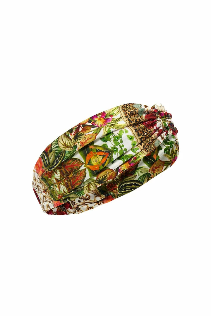 A widely adored piece of bohemian hair styling, the Fair Verona Ring Headband is a vivid silk canvas of lush garden scape. Inspired by a story of forbidden love, this printed silk headpiece has an elasticated fit and is crowned with a whimsical metal ring detail. Hand-place CAMILLA crystals add a final dazzling flourish to this turban style headband. Wear with matching current season resort and swimwear prints for a relaxed boho vibe.